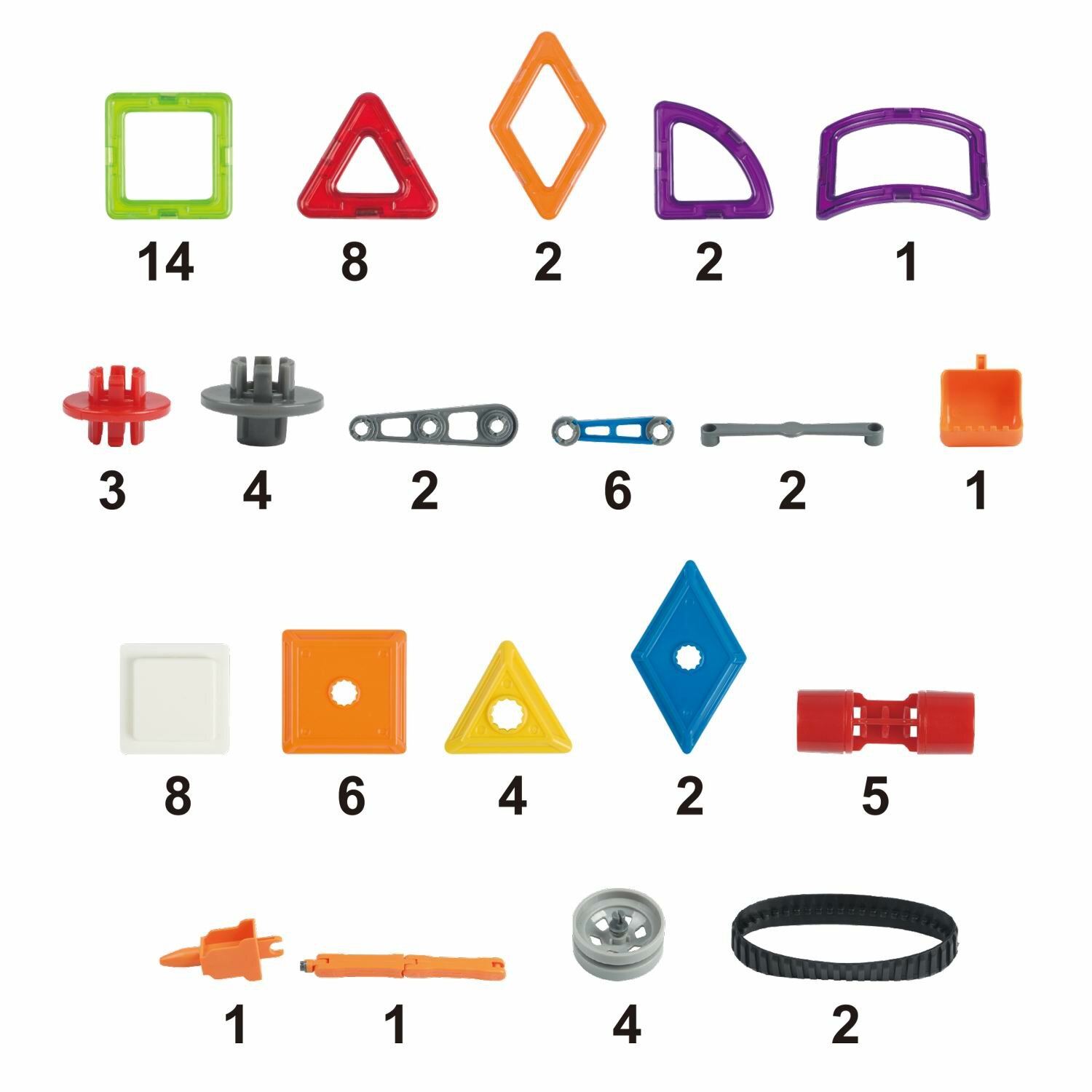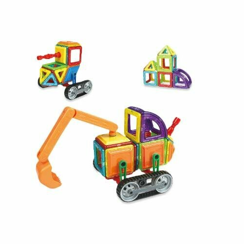 Если ваш малыш еще только начинает свое знакомство с конструкторами, то предложите ему потренироваться на разноцветных деталях из этого набора. Ведь они дополнены магнитными сердцевинами, поэтому легко соединяются межу собой, образуя в итоге реалистичные транспортные средства и даже фантастического робота.