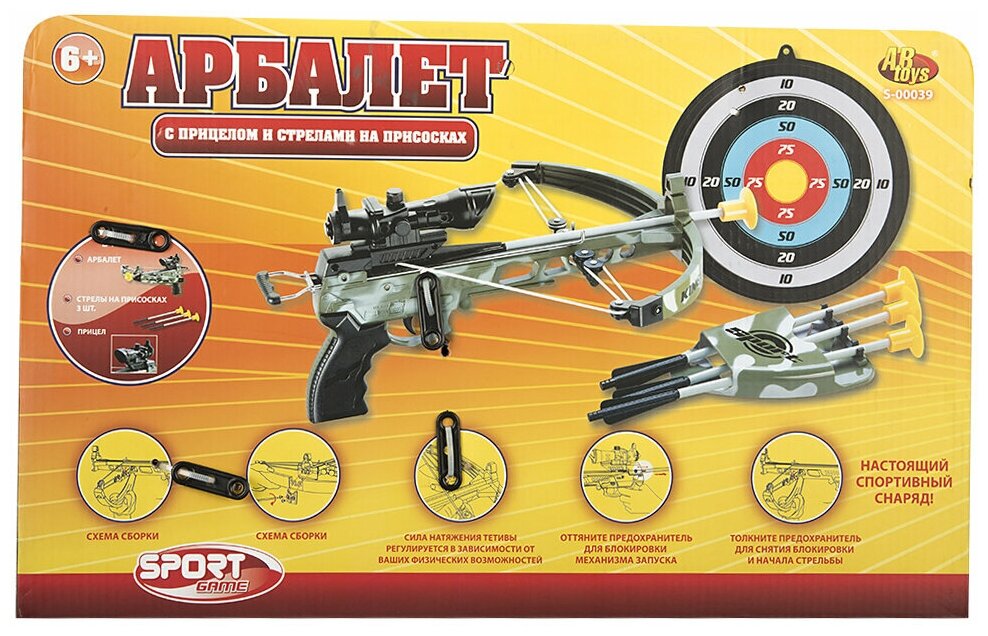 | Комплектация | арбалет; прицел; стрелы - 3 шт; мишень; держатель для стрел |