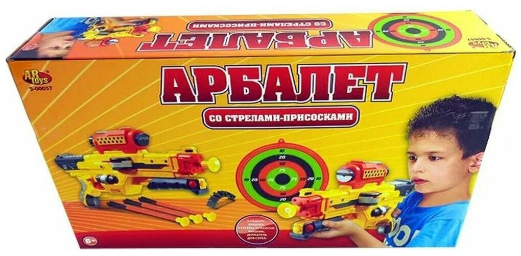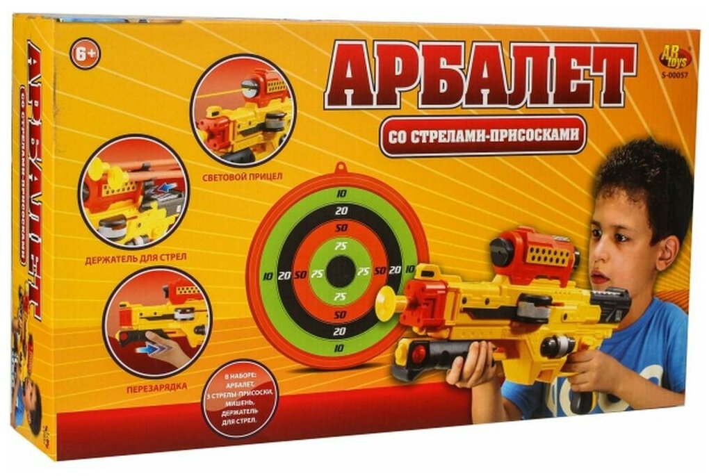 Арбалет ABtoys со стрелами на присосках желтый (3 стрелы мишень и держатель для стрел) S-00057 Арбалет со стрелами на присосках S-00057