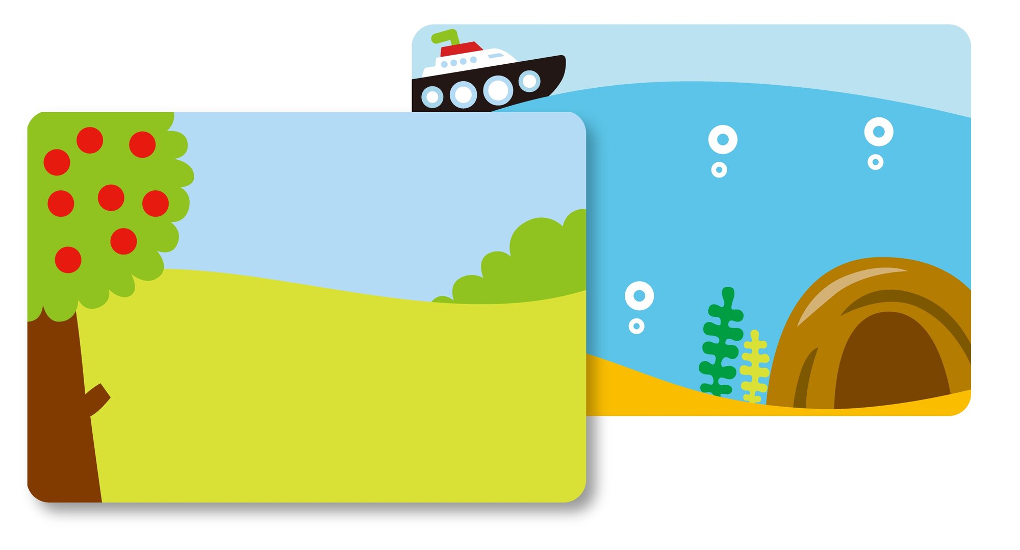 Помимо элементов, есть 2 маркера с стирающей губкой на обратной стороне, которыми можно рисовать на доске. Магнитная доска с 4 разноцветными тематическими карточками, которые помогут ребенку создать свою картинку. Набор из 77 элементов.