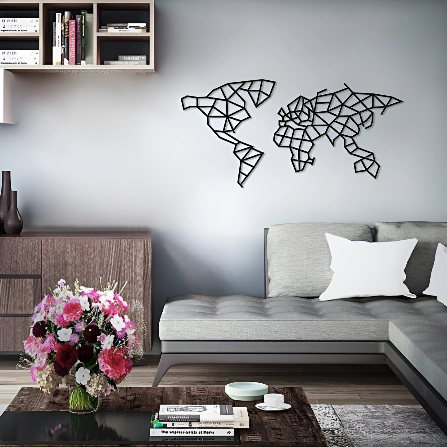 Целая серия деревянных интерьерных пазлов на стену - EWA Design от Eco Wood Art. Несложный полигональный конструктор, но принесет усладу для глаз и освежит ваши монотонные стены. Вариант размещения на стене вы можете наблюдать на фотографии.