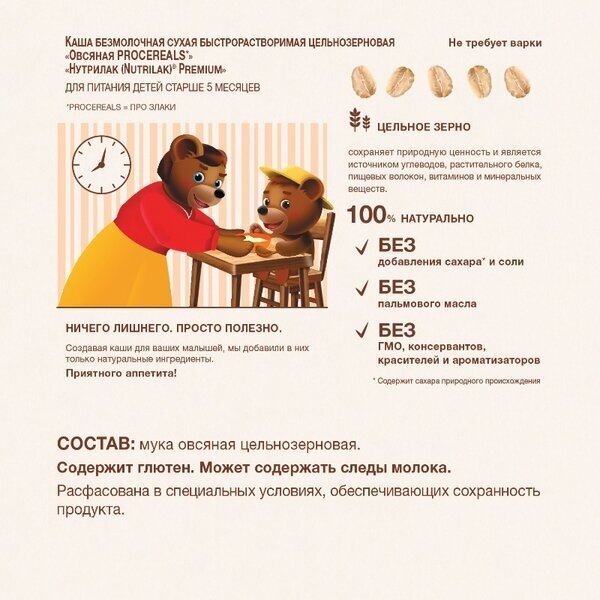 Каша овсяная Nutrilak Premium Pro Cereals цельнозерновая безмолочная разработана с использованием принципа " Чистая этикетка" :