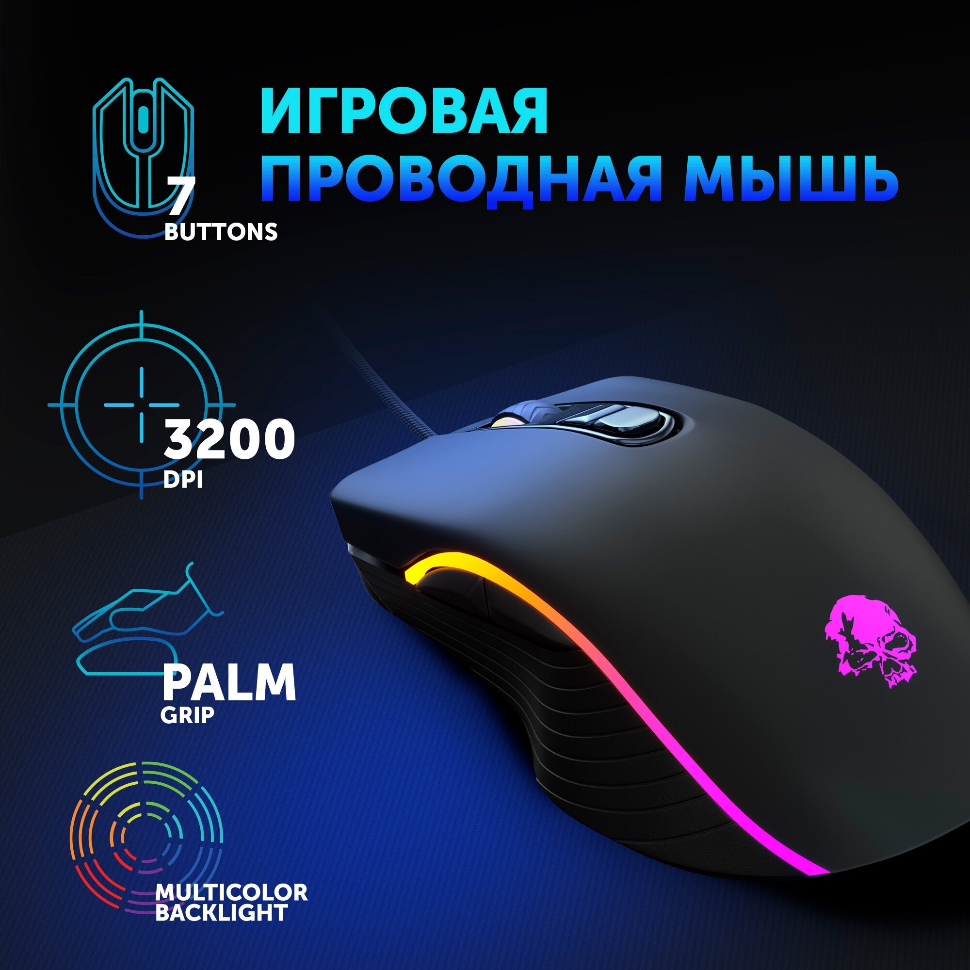 Мышь проводная Oklick 708G Mystery – стильная и функциональная игровая модель с семью кнопками, среди которых имеются боковые клавиши и переключатель чувствительности датчика. Оптический LED-сенсор может работать с разрешением 800, 1600, 2400 или 3200 dpi. Устройство Oklick 708G Mystery представлено в стильном черном корпусе, украшенном черепом, с покрытием Soft Touch и конструкцией для ухвата правой рукой. Данная модель оснащена USB-кабелем длиной 1.5 м. Предусматривается наличие разноцветной подсветки. Мышь весит всего 100 г, а ее размеры составляют 7x4.1x12.7 см.