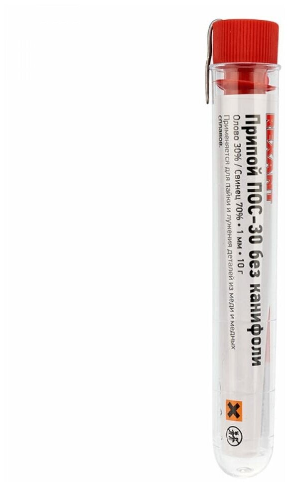 ПОС-30 - это высококачественный оловянно-свинцовый припой от REXANT. Применяется для пайки деталей из меди, жести, латуни, цинка и т.д. Рекомендован для создания соединений в радиоаппаратуре и электроприборах, с его помощью возможна пайка коммуникационных труб. Удобен для применения в быту.