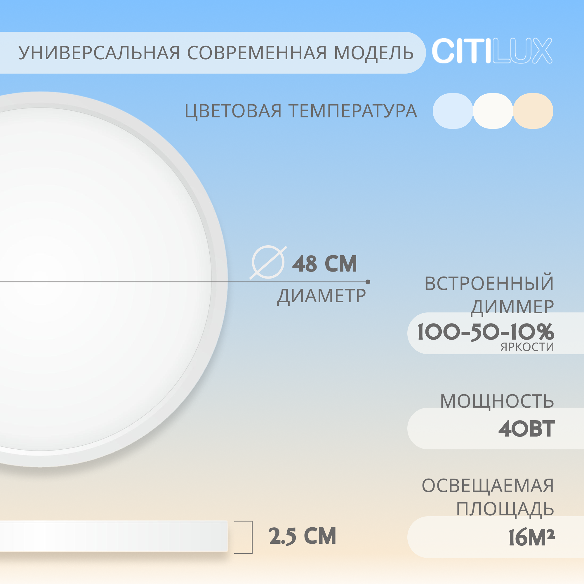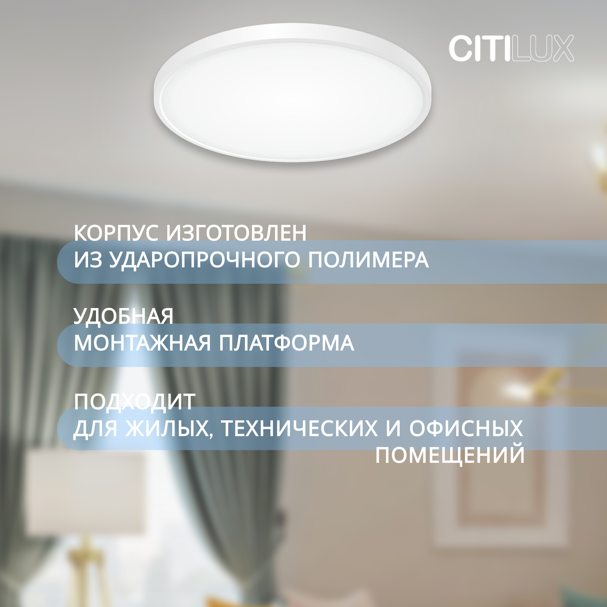 Светильник Citilux CL738400V серии Бейсик. Подчеркнет стиль помещения. Высота 2.5 cm. Диаметр 48 cm Параметры пылевлагозащиты IP — 40. Плафон полимерный белого цвета, а материал/цвет арматуры пластик/белый. Идеально подходит для детской, для спальни, для гостиной, для прихожей, для ванной. Страна происхождения бренда — Дания.