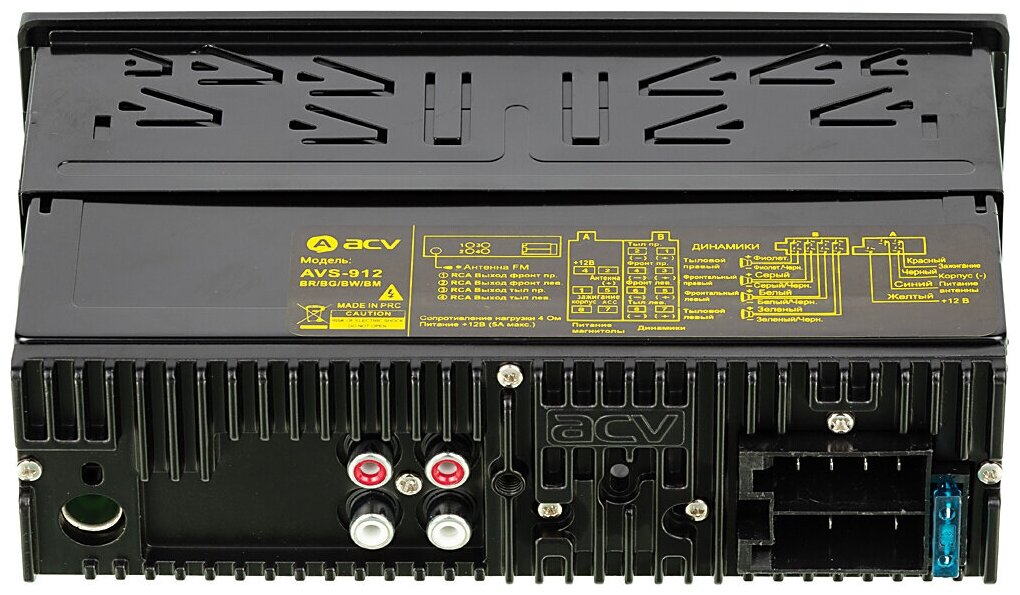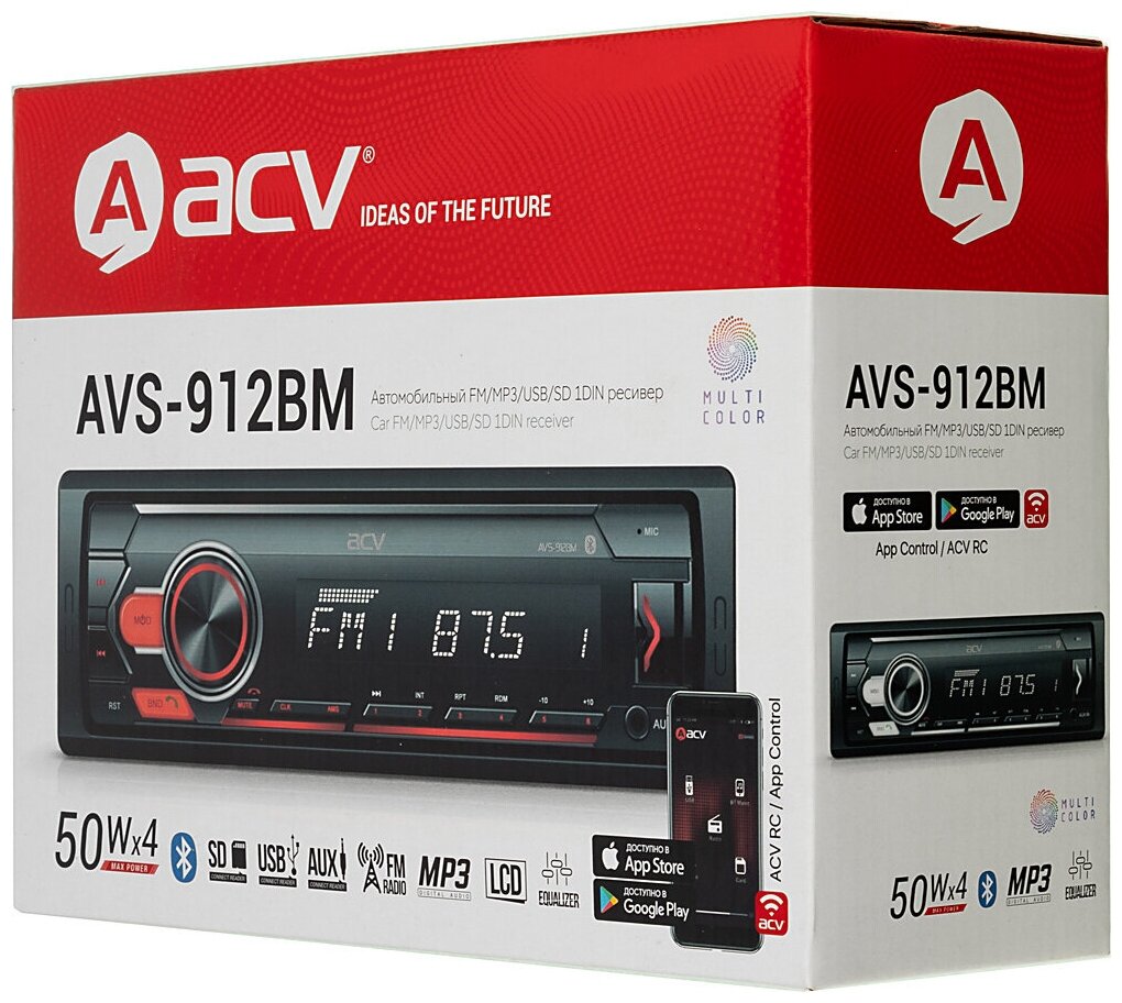 | Прочие особенности и свойства | ACV AVS-912 – это самые современные опции для воспроизведения аудио в высоком качестве. Имеет подсветку кнопок мультитцвет, поддерживает наиболее популярные источники звука:USB и SD цифровые носители, смартфоны Android и iOS (через приложения ACV RC и ACV Control).,,Цифровой FM тюнер обеспечивает качественный прием станций без помех, их можно настроить автоматически или в ручном режиме. При чтении носителей на экран магнитолы выводятся директории и ID3-теги:название альбома, песни, исполнителя и т.д.,,Модуль Bluetooth поддерживает протоколы A2DP, HFP, PBAP для совершения телефонных звонков в режиме Hands-Free и воспроизведения контента со смартфонов.,,Устройство оснащено встроенным усилителем 4х50 Вт, с ним Вы получите хорошую громкость при воспроизведении аудио, возможность построить систему автозвука любой архитектуры благодаря RCA выходам.,,Помимо четырех предустановок эквалайзера у ресивера есть баланс правых и левых, передних и задних акустических компонентов, изменение тембра ±8дБ и другие опции. С таким головным устройством поездки на автомобиле станут более комфортными и интересными.,,Поддержка мобильных приложений для ANDROID И IOS,Мобильные приложения ACV RC для Android и ACV Control для iOS предназначены для беспроводного управления автомобильными магнитолами ACV, оснащенными Bluetooth модулем, с Вашего мобильного устройства.,,Приложение ACV RC позволяет управлять воспроизведением музыки, переключать источники сигнала (FM тюнер, Bluetooth аудио, USB, AUX, microSD), изменять настройки звука магнитолы ACV. |