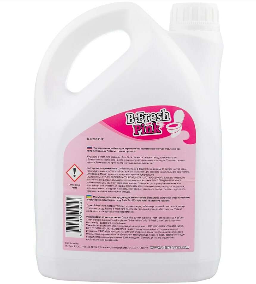 Туалетная жидкость Thetford B-Fresh Pink – это добавка розового цвета для верхнего бака биотуалетов. Благодаря своему биологическому воздействию после смыва воды на поверхности унитаза остается защитный слой, который препятствует формированию отложений и смазывает резиновое уплотнение клапана.