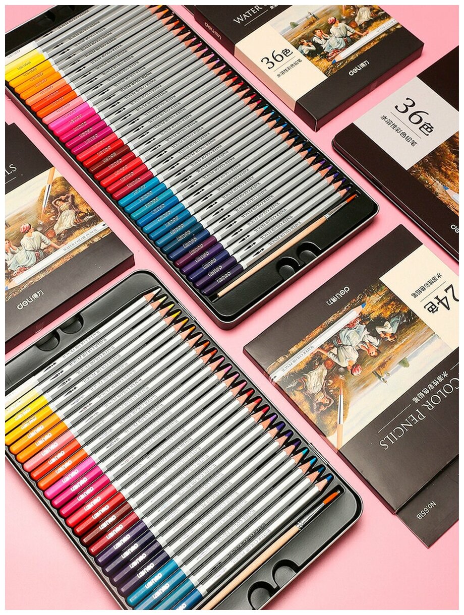 Deli Карандаши цветные акварельные в металлической коробке Nuevo 48 цветов Изделия снабжены грифелями ярких, насыщенных цветов. Линии мягко ложатся на бумагу. Целых 48 цветных акварельных карандаша в лаконичном корпусе. При контакте с водой штрихи карандаша теряют четкость линий, превращаясь в яркий оттенок.