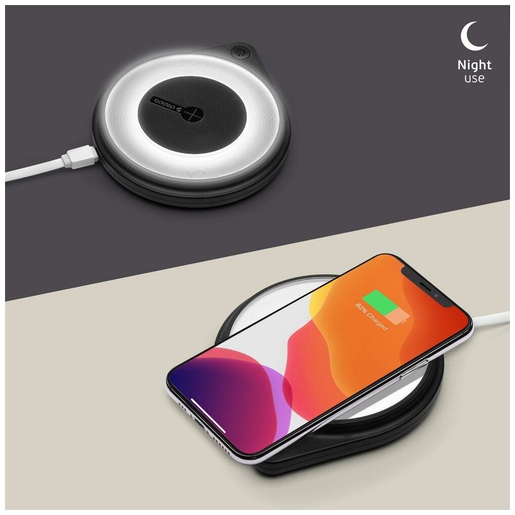 | Описание | Зарядное устройство с технологией QI позволит быстро зарядить ваш смартфон, просто положив его на панель беспроводной зарядки, Подходит для: Все мобильные устройства и аксессуары с поддержкой стандарта QI, разработанного консорциумом WP, Беспроводное ЗУ Qi Fast Charger, 10W, стандарт Qi, ночник, черный, Deppa |