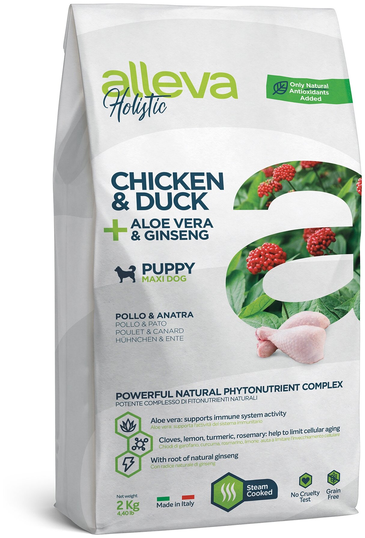 Alleva Holistic Chicken & Duck + Aloe vera and Ginseng Puppy Maxi. Alleva Holistic Курица, Утка, Алое вера и Женьшень. Полнорационный сухой корм для щенков крупных пород, беременных и кормящих сук.