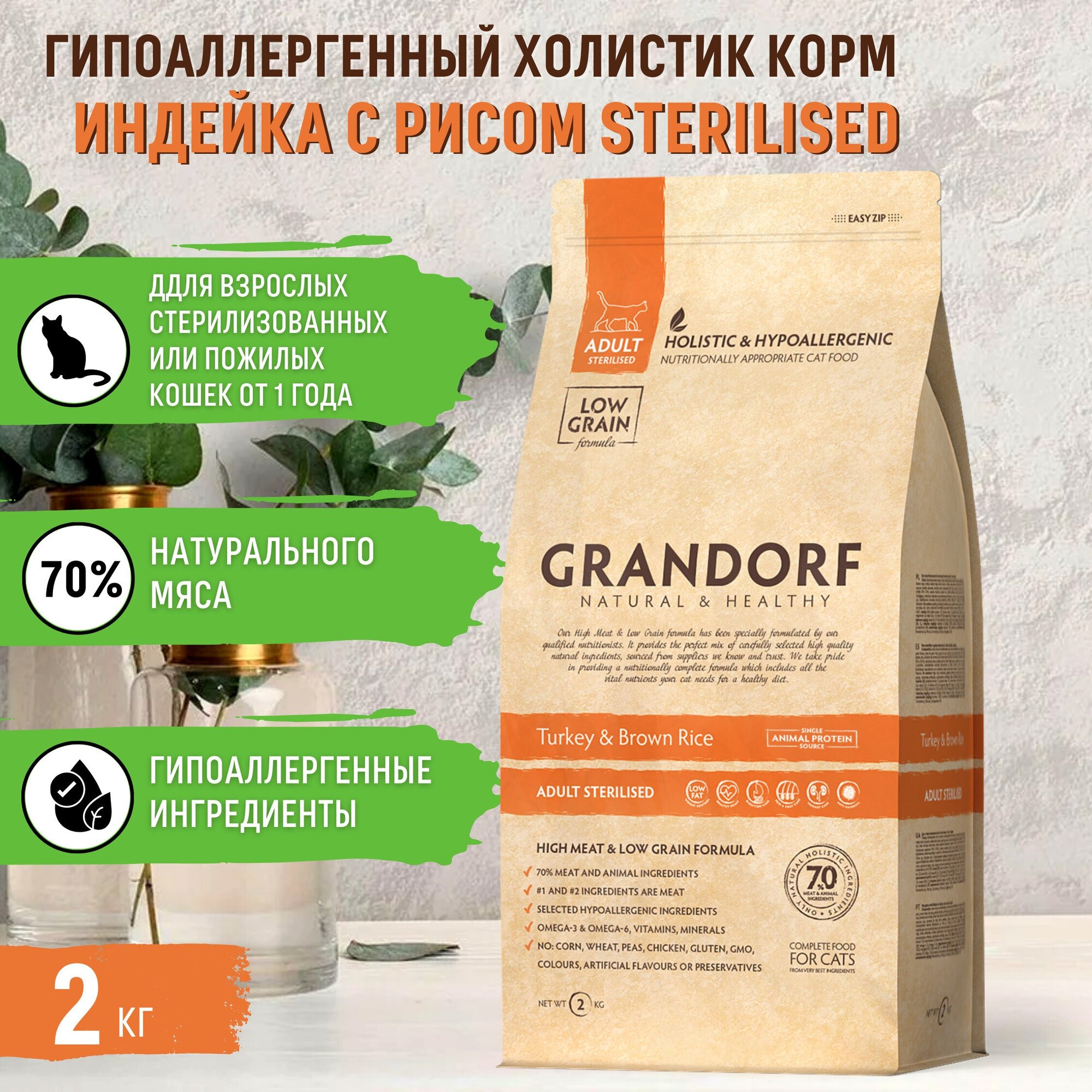 Grandorf Sterilised индейка с рисом. Сухой корм Грандорф с индейкой и рисом предназначен для взрослых стерилизованных кошек всех пород. По ингредиентному составу относится к кормам класса холистик. Благодаря высокому содержанию мяса индейки и отстутствию мяса курицы, данный корм обладает гипоалергенными свойствами и хорошо подойдет большенству кошкек, страдающим от пищевой аллергии.