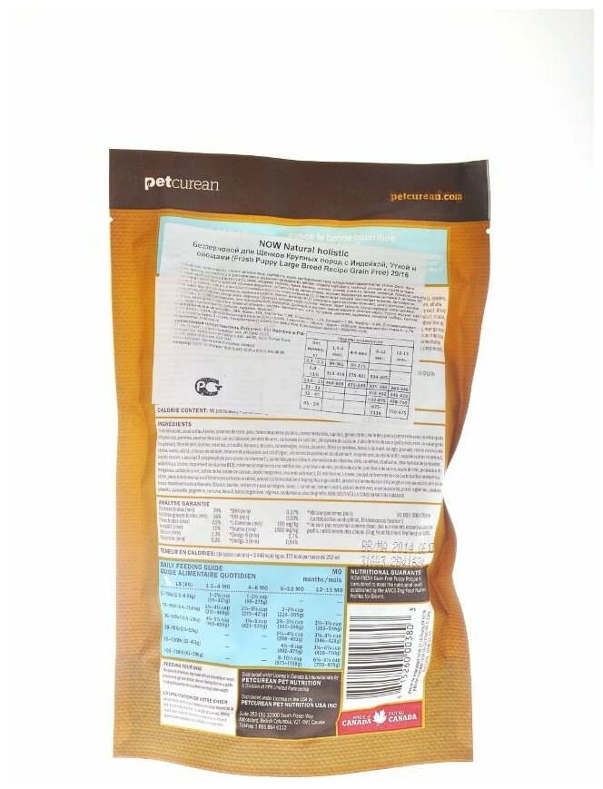 Корм NOW FRESH Grain Free Large Breed Puppy изготовлен в Канаде и является беззерновым кормом класса холистик. Данный корм приготовлен из свежего мясного филе утки и индейки, которые были выращены в Канаде на фермах, и из свежего мяса лосося, который был выловлен в Британской Колумбии. В составе есть цельные овощи, фрукты и ягоды. Для приготовления корма было использовано только свежее мясо утки, индейки и лосося. Гранулы корма настолько свежие, что кажется, будто это еда с домашней кухни.
