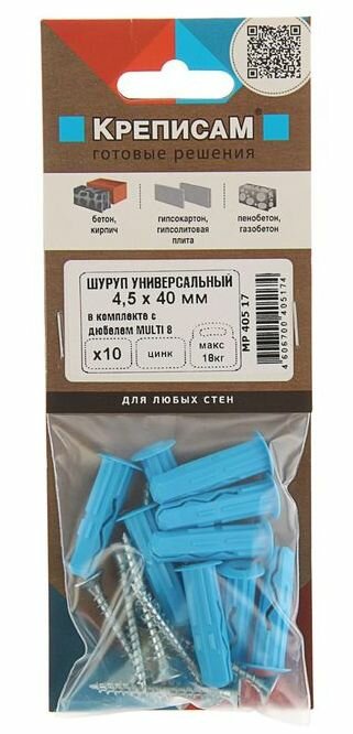 Комплект универсального крепежа предназначен для установки в любые материалы: бетон, камень, кирпич, газобетон, пенобетон, гипсокартон, гипсолитовая плита. Шестигранная форма дюбеля предотвращает проворачивание в стене, его широкий, но тонкий фланец препятствует продавливанию в стену. Материал дюбеля - нейлон. Материал шурупа - электрооцинкованная сталь.