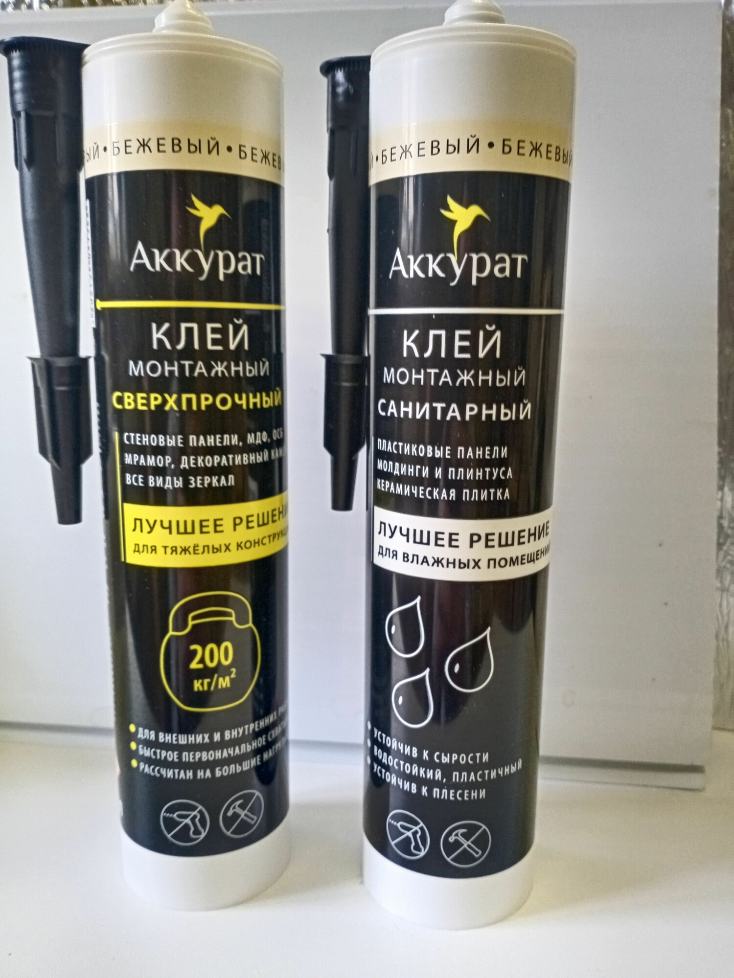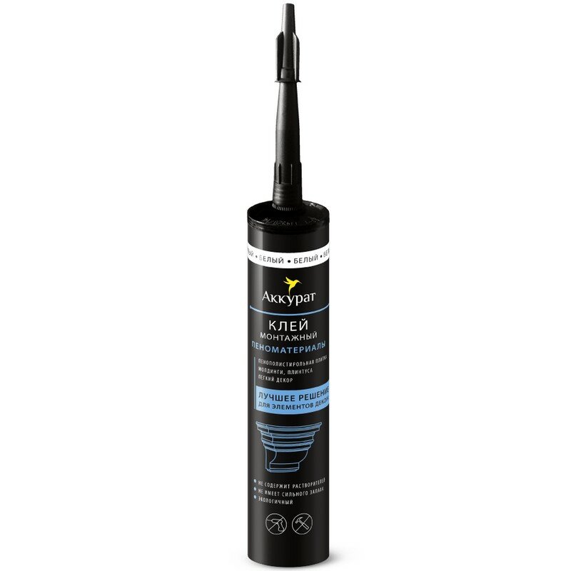 Клей монтажный Сверхпрочный ТМ Аккурат является однокомпонентным клеем на базе растворителей, рассчитанным на большие нагрузки. Характеризуется отличной адгезией к большинству материалов, используемых в строительстве (камень, кирпич, бетон, штукатурка, дерево и т.д.), и прочностью соединения. Клей обладает быстрым первоначальным схватыванием, что уменьшает возможность сползания приклеиваемых к вертикальным поверхностям тяжелых элементов (стеновые панели, панели МДФ и ОСБ, мрамор, декоративный камень и т.п.). Не разъедает амальгаму - подходит для приклеивания всех видов зеркал. Подходит для внешних и внутренних работ. Температура эксплуатации от -20 до +70 С.