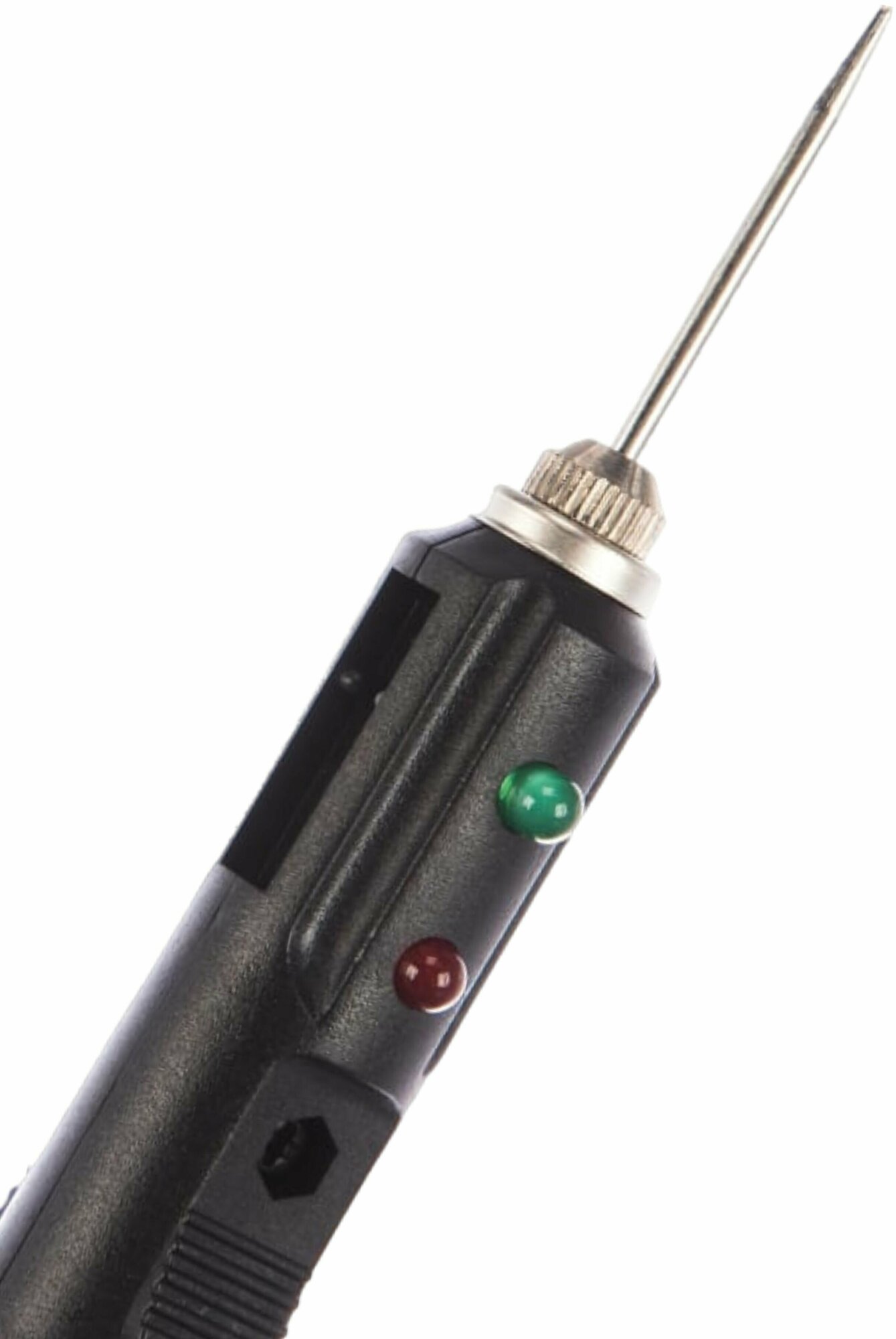 Определяет полярность напряжения (+/-), обрыв и замыкание проводки, тестирует предохранители, лампочки, диоды. Разработан с учетом особенностей ремонта автомобиля: длинный стержень позволяет дотянуться до труднодоступных мест, корпус оснащен световым/звуковым индикатором, креплением «крокодил».