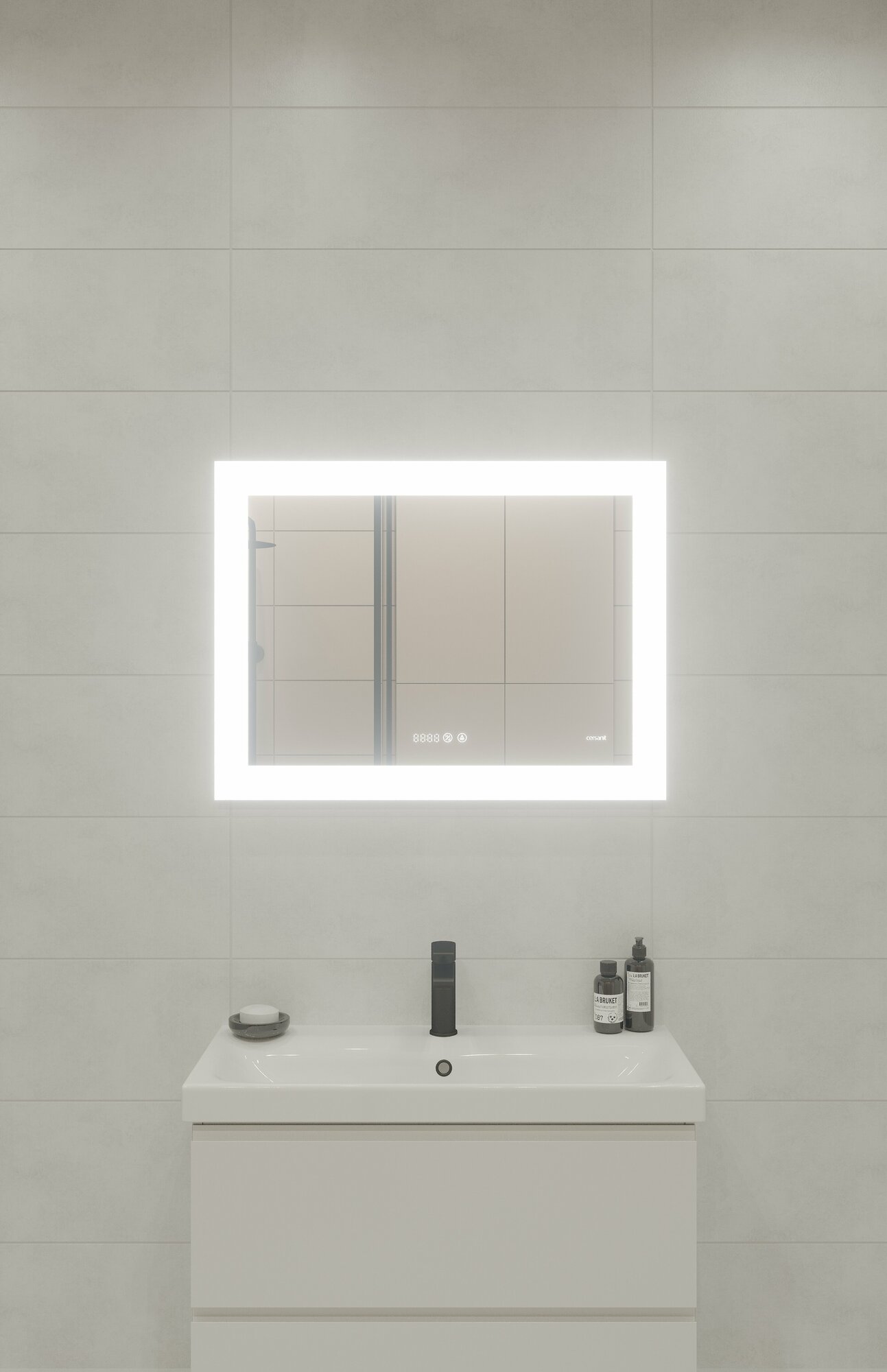 Зеркало LED c подсветкой, с фукцией антизапотевания и часами сочетается с мебелью для ванной комнаты, подходит для размещения в помещениях с повышенной влажностью.