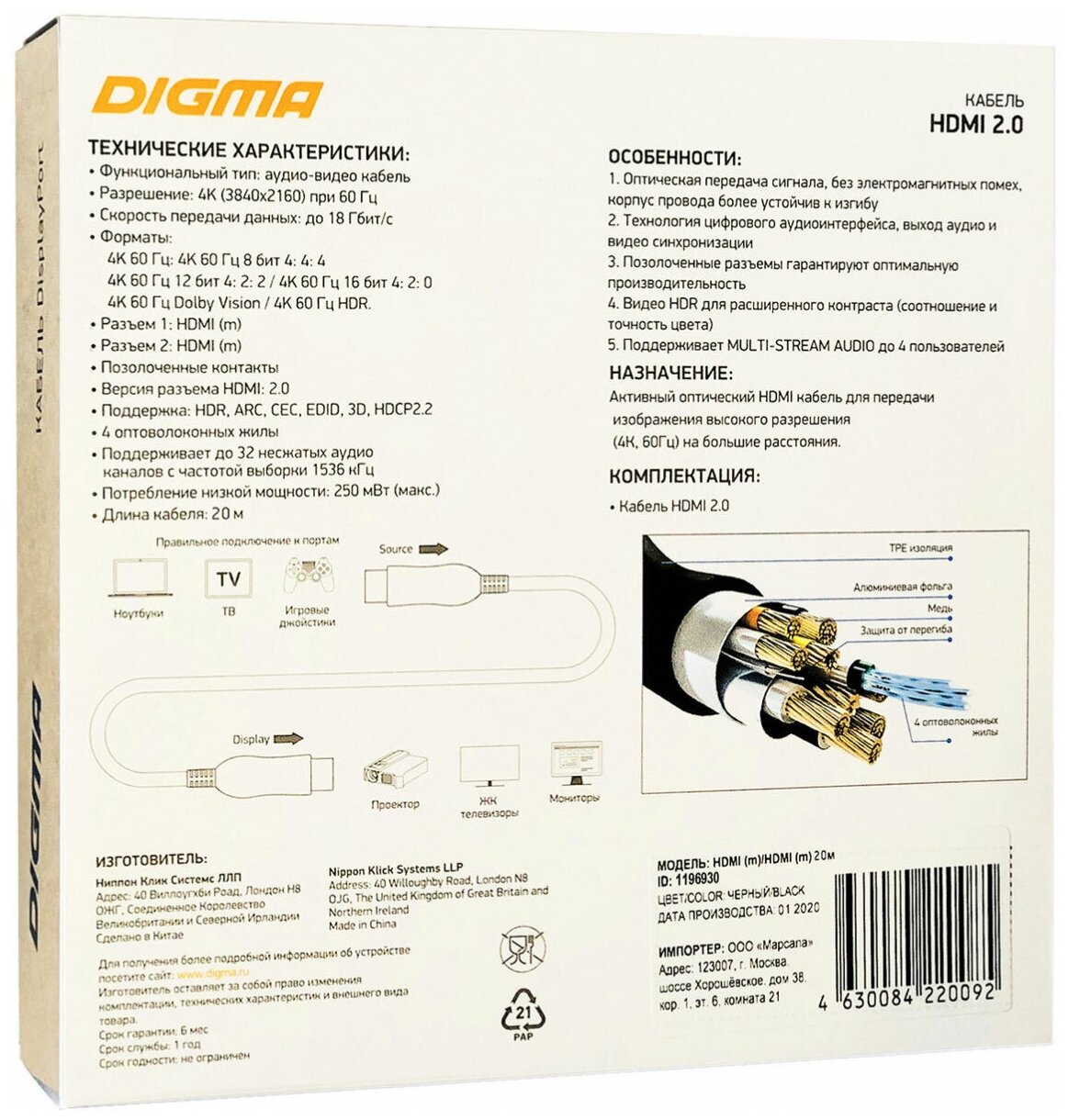 Кабель аудио-видео Digma HDMI 2.0 AOC HDMI (m)/HDMI (m) 20м. Позолоченные контакты черный (BHP AOC 2.0-20)