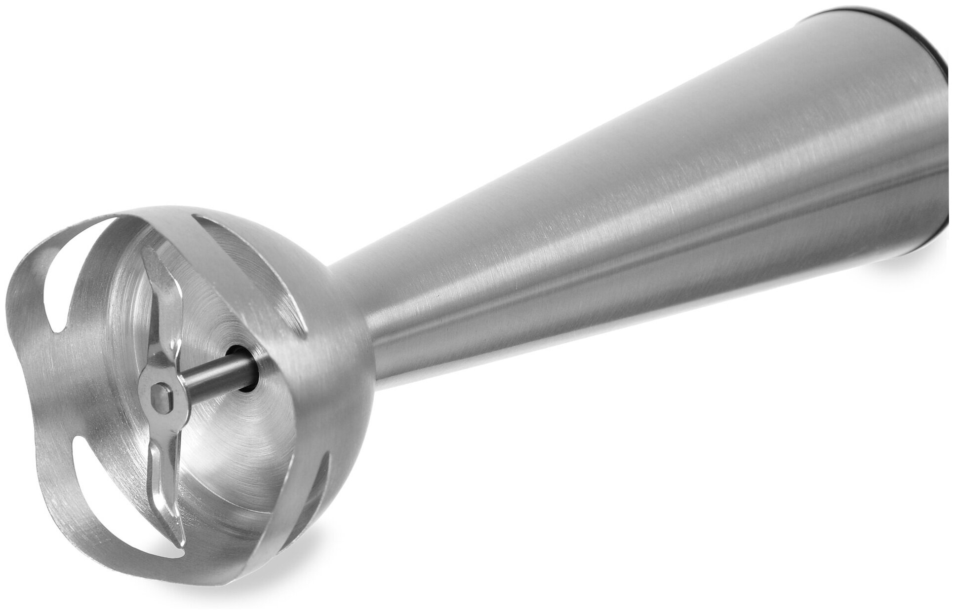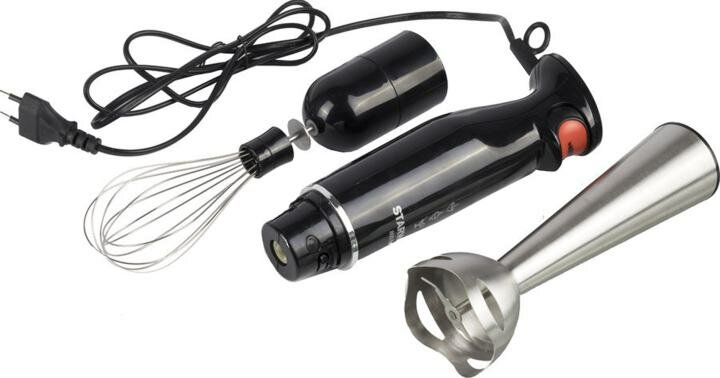 В наборе также имеются 3 насадки: венчик, насадка-блендер и измельчитель. Это позволяет использовать погружной блендер для различных задач, будь то взбивание сливок, приготовление соусов или измельчение орехов;