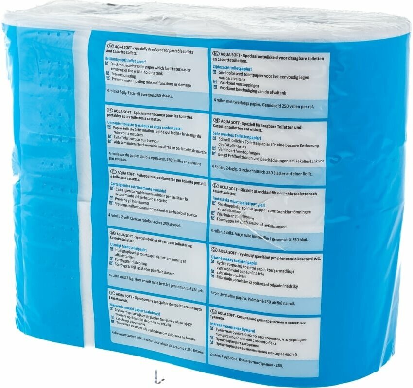 Специальная, мягкая и легкорастворимая туалетная бумага для любых типов биотуалетов. Разлагается вместе с отходами. Не засоряет сливные и канализационные системы. Количество листов в рулоне: около 250 штук.