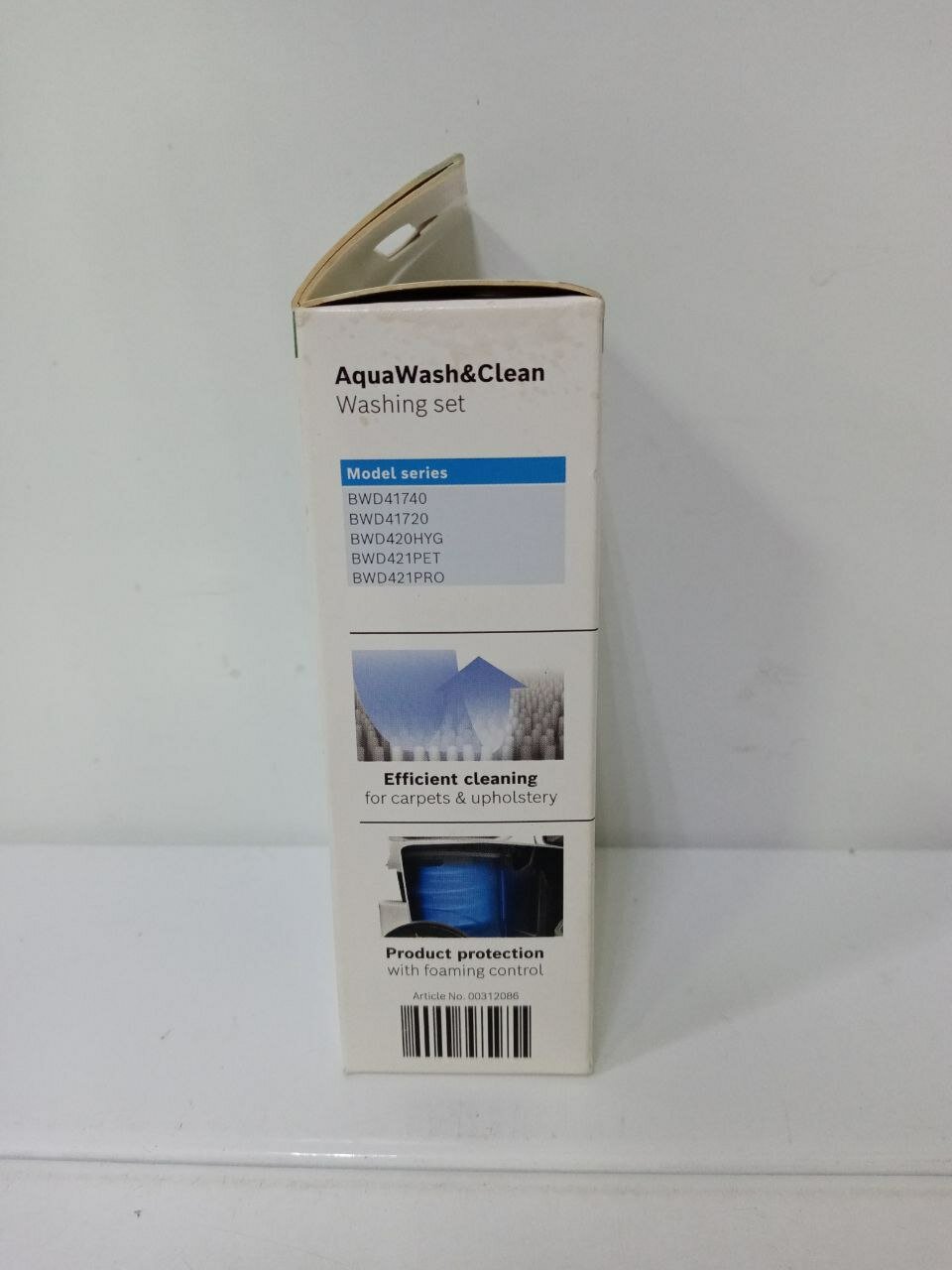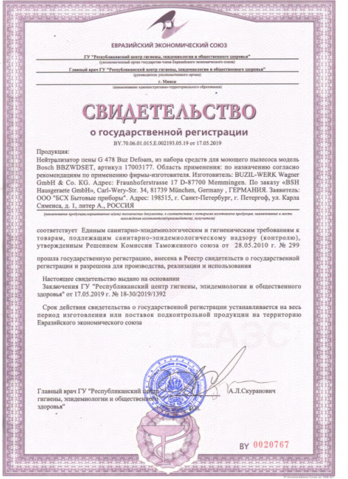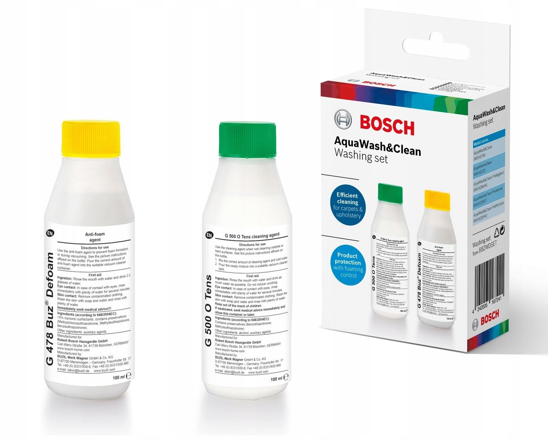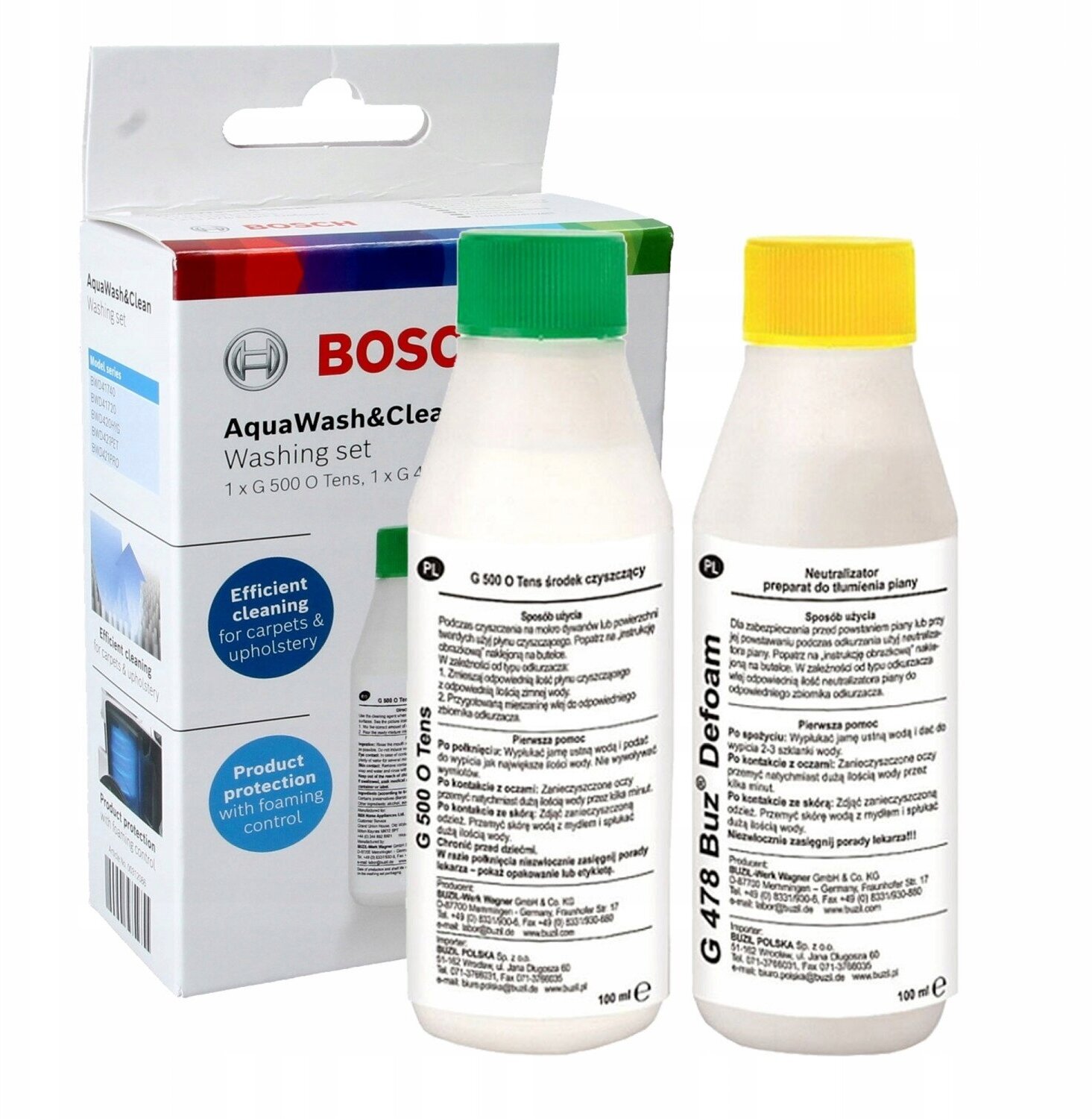| Прочие особенности и свойства | Моющее средство:обеспечивает эффективную очистку ковров и обивки с помощью пылесосов Bosch AquaWash & Clean. ,,Пеногаситель для предотвращения роспространения пены. |