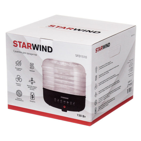 | Прочие особенности и свойства | Сушка – древний и универсальный способ хранения многих продуктов, который обеспечивает сохранение минеральных элементов и витаминов, а также других полезных веществ. Благодаря миниатюрной электросушилке вы сможете заготовить самые разнообразные продукты на зиму, при этом они будут занимать небольшой объем. Зато зимой, ароматное рагу с душистыми приправами, вкуснейший компот из сухофруктов и целебный чай из трав с цитрусовыми будет очень кстати. Но это еще не все, STARWIND SFD1510 позволяет вялить мясо и рыбу. Любимые всеми сушеные кусочки рыбы или мяса, сделанные собственноручно, удивят и восхитят ваших гостей., , Для приготовления сушеных продуктов в конструкцию прибора входят пять специальных пластиковых поддонов, шириной 33 сантиметра и высотой 3 сантиметра. На их поверхности раскладываются тонко порезанные ломтики овощей, фруктов, мяса, рыбы или грибов. Обратите внимание, что для каждого продукта существует свое время приготовления, о котором написано в инструкции по использованию. |