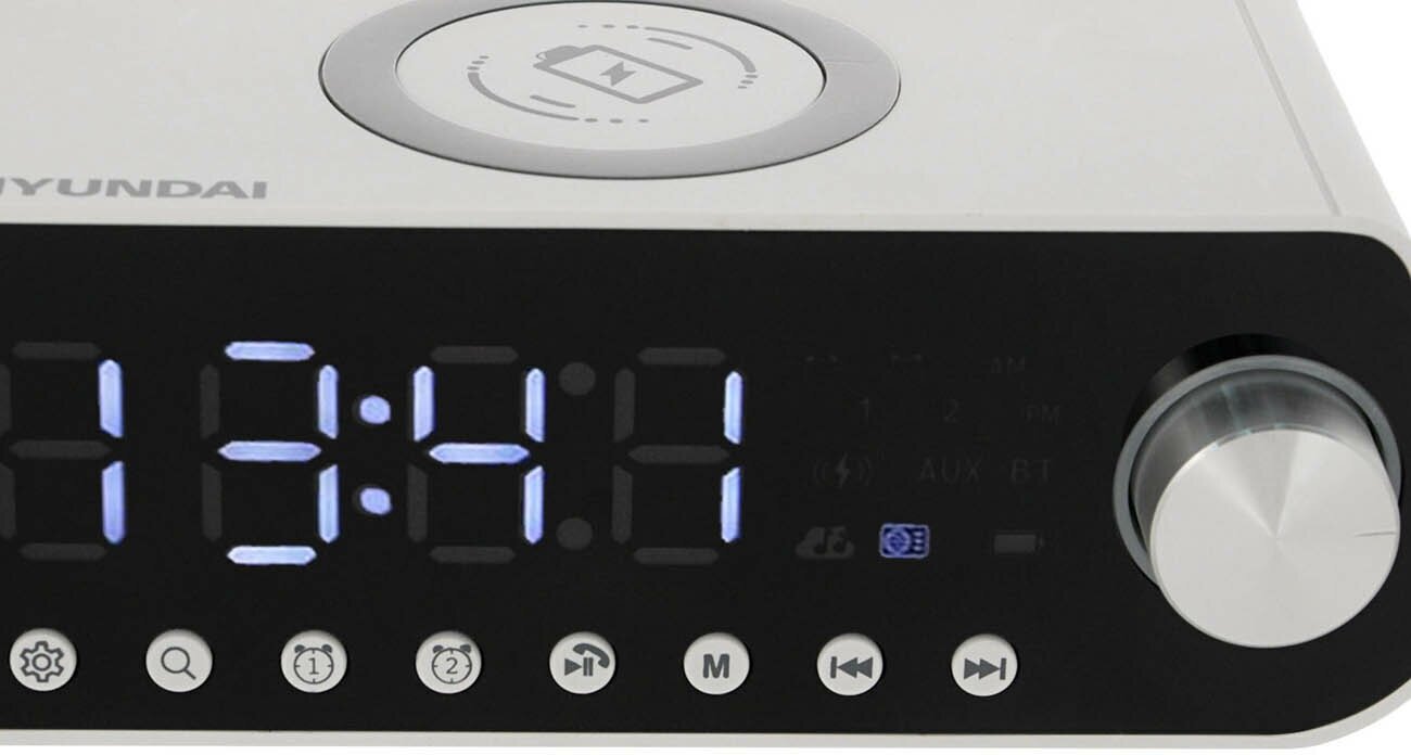 HYUNDAI Радиобудильник - портативный радиобудильник мощностью 10 Вт с функцией электронных часов и радио воспроизводит частоты FM диапазона. Соотношение сигнал/шум составляет > 70 дБ. Если радио надоест, всегда можно включить любимый плейлист: подключить смартфон или ноутбук к прибору можно с помощью Bluetooth (A2DP), через линейный вход AUX или посредством USB. Устройство поддерживает популярные аудио-форматы MP3 и WAV. Одно из главных достоинств радиобудильника Hyundai - его портативность. Время работы без подзарядки - до 6 часов. Основной особенностью является беспроводная зарядка смартфонов, поддерживающих эту функцию. Привлекательный внешний вид гаджета делает его стильным аксессуаром в любом интерьере. Размер: 18.2х9.1х6.4 см.