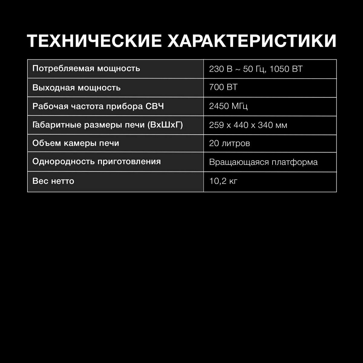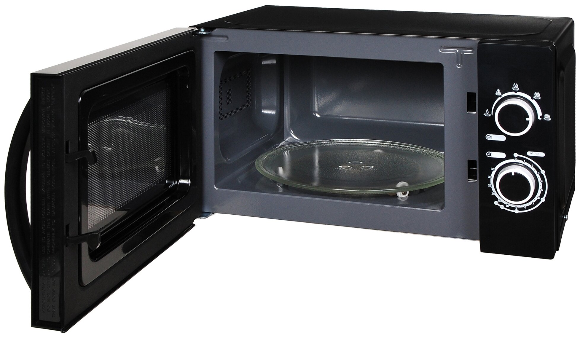 Микроволновая печь отличается стильным современным дизайном. Выполнена в черном цвете, исключение составляют белая маркировка и логотип. Набор функций является оптимальным для такого прибора. Доступны размораживание, в том числе в автоматическом режиме, и подогрев уже готовой еды. Управление отличается простотой. Достаточно установить уровень мощности и время, дальше устройство включится само. После окончания процесса прозвучит мягкий звуковой сигнал. Открыть дверцу можно при помощи удобной ручки, приложив небольшое усилие. Прибор устанавливается на столешницу, при этом надо следить, чтобы были свободными вентиляционные отверстия для доступа воздуха. За внутренней поверхностью очень легко ухаживать благодаря абсолютно гладкому эмалированному покрытию. С него без особого труда убираются любые загрязнения.