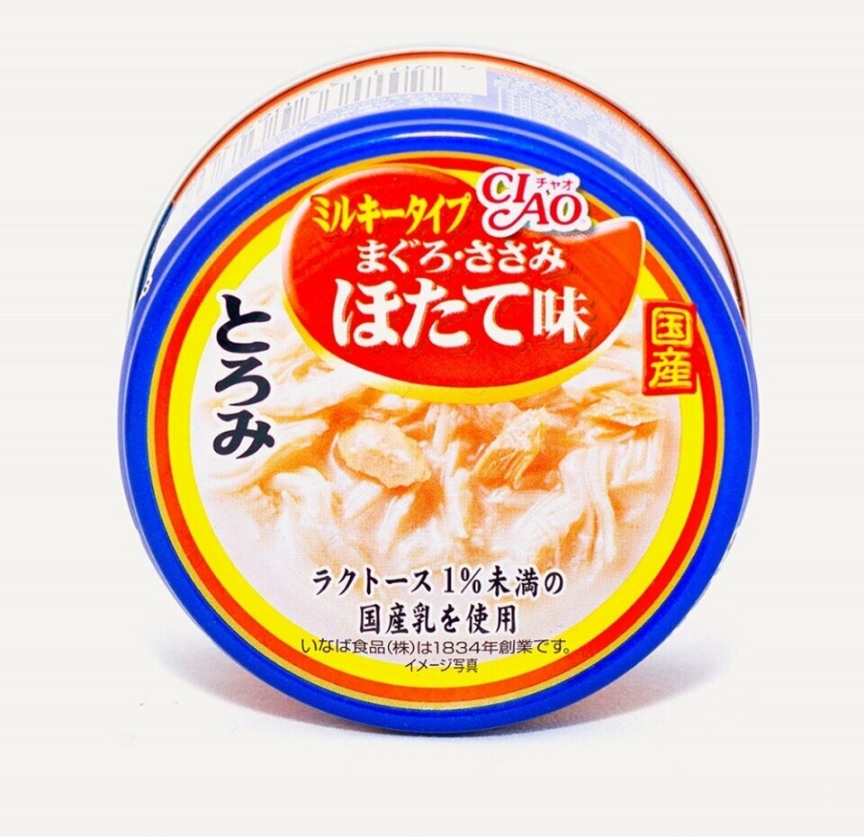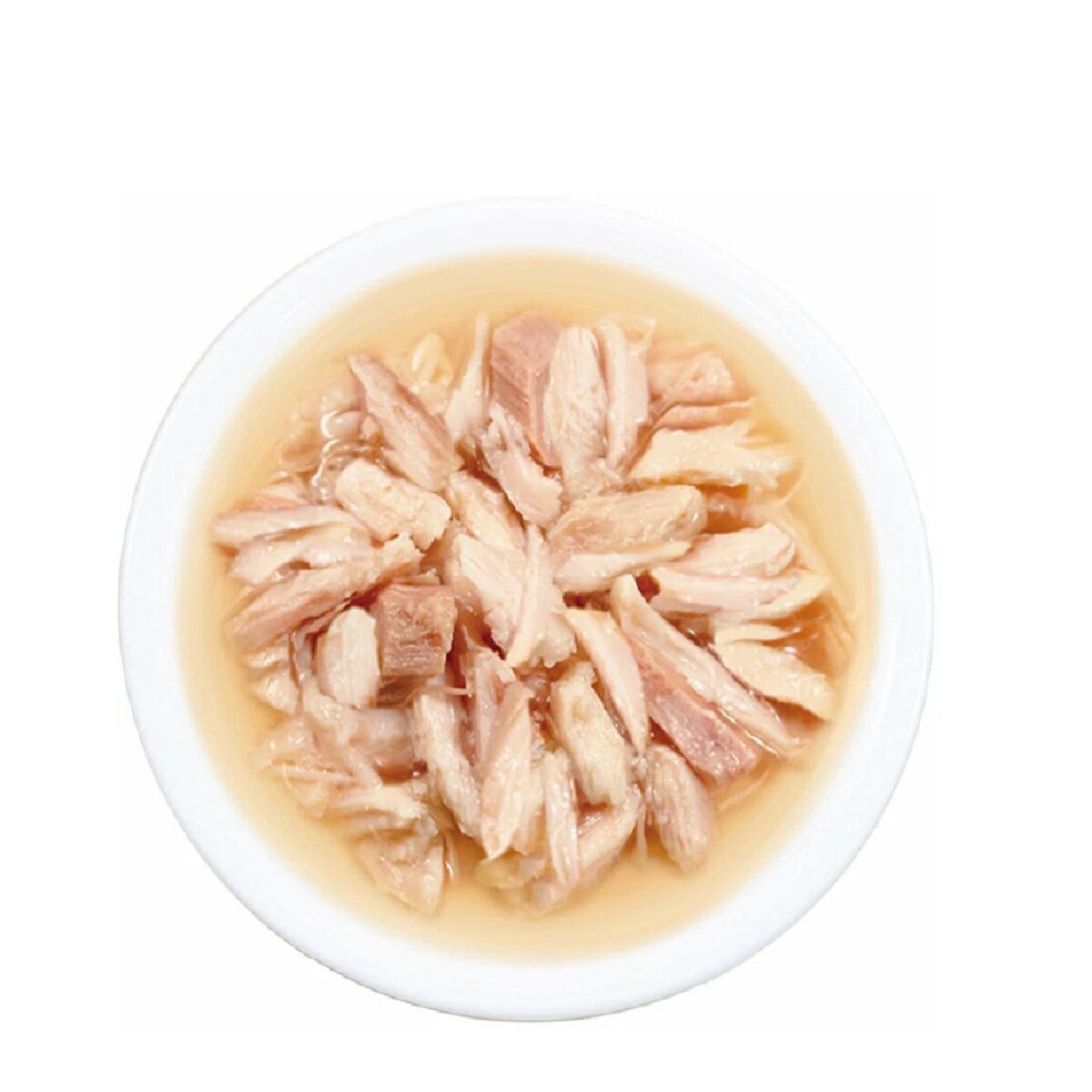 | Состав | Состав: куриное филе, молоко (безлактозное), тунец магуро, экстракт морского гребешка, олигосахариды, растительные жиры, крахмал, минеральные вещества, аминокислоты, полисахариды, витамин Е, экстракт зеленого чая белок – не менее 7,5%, жиры – не менее 1,2%, клетчатка – не более 0,1 %, зола – не более 1,5%, влажность – не более 90% 45 ккал/банка |