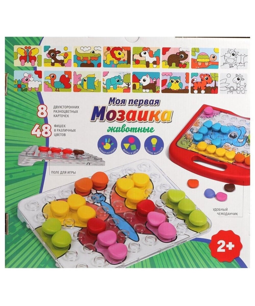 Комплектация: игровое поле, картинки-шаблоны - 8 шт., 48 крупных разноцветных элементов