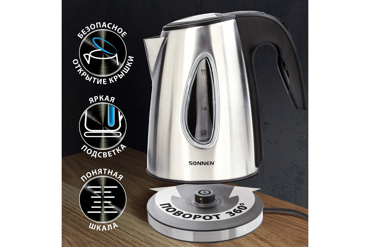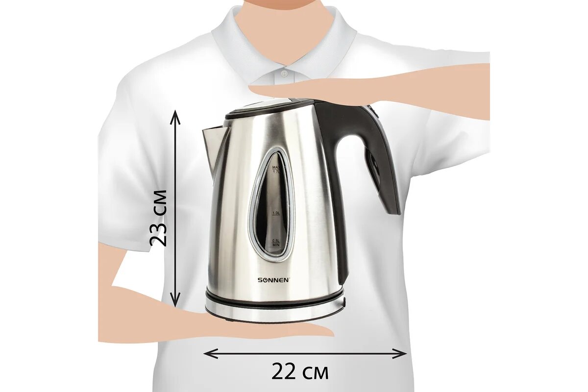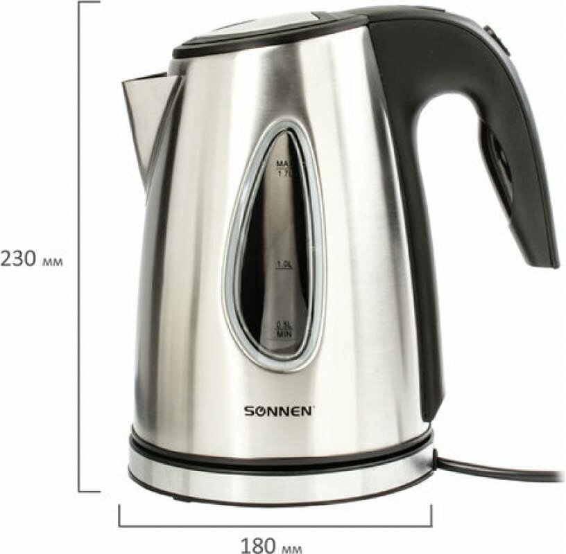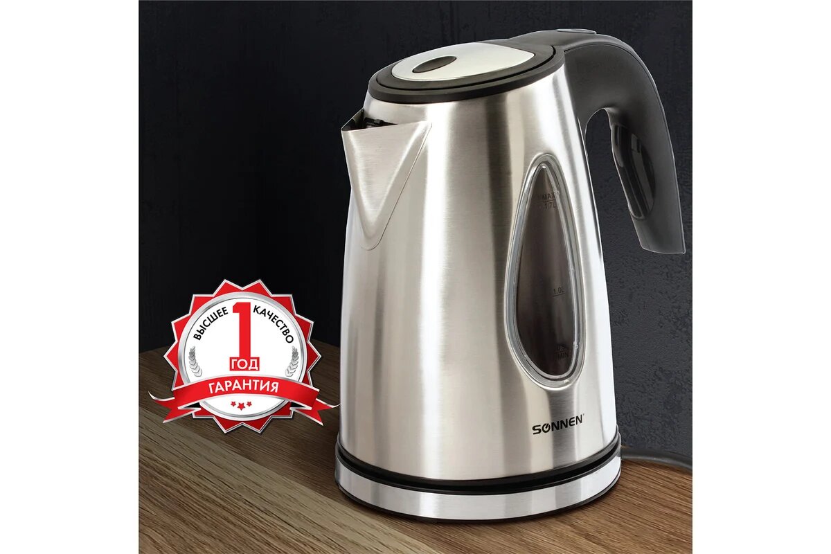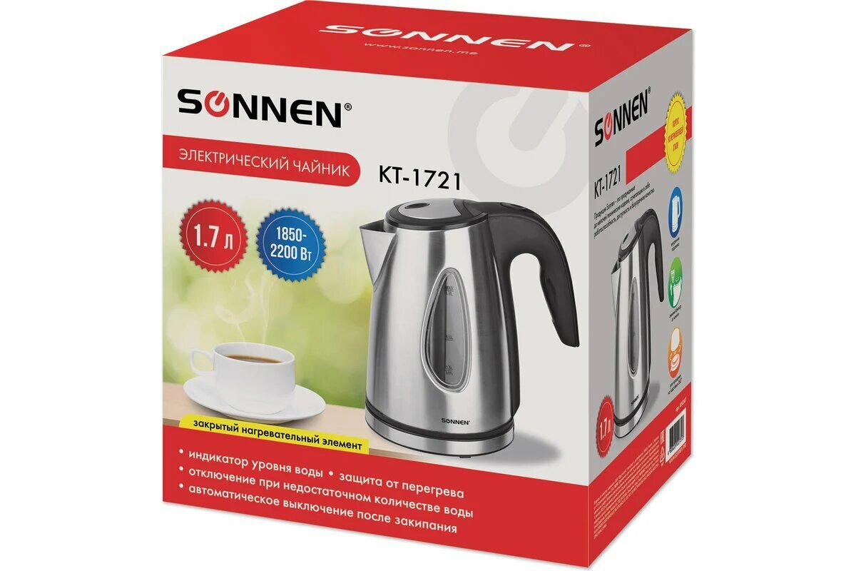 | Прочие особенности и свойства | Чайник SONNEN KT-1721 отлично подходит для эксплуатации как дома, так и в офисе. Интерьер приобретет стильное звучание благодаря чайнику с корпусом из нержавеющей стали в стиле "хай-тек". |