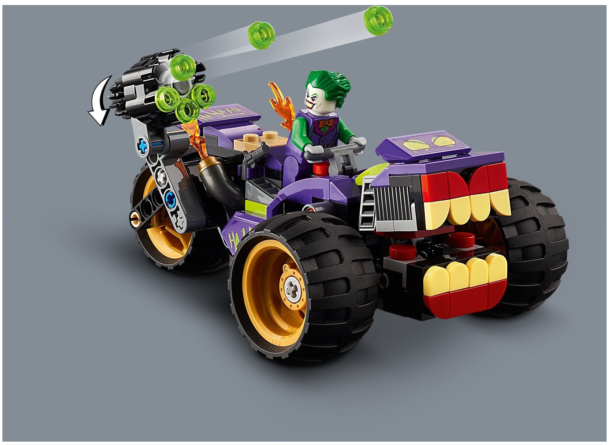 В набор входят четыре минифигурки и бэтмобиль с открывающейся кабиной для минифигурки Бэтмена и съёмным двигателем. На руле трицикла ДЖОКЕРА изображён улыбающийся рот, который открывается и закрывается, когда мотоцикл едет.