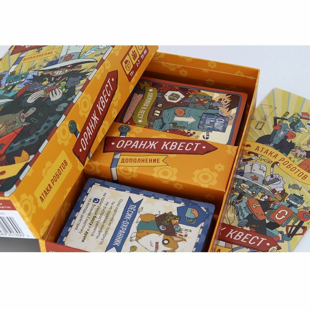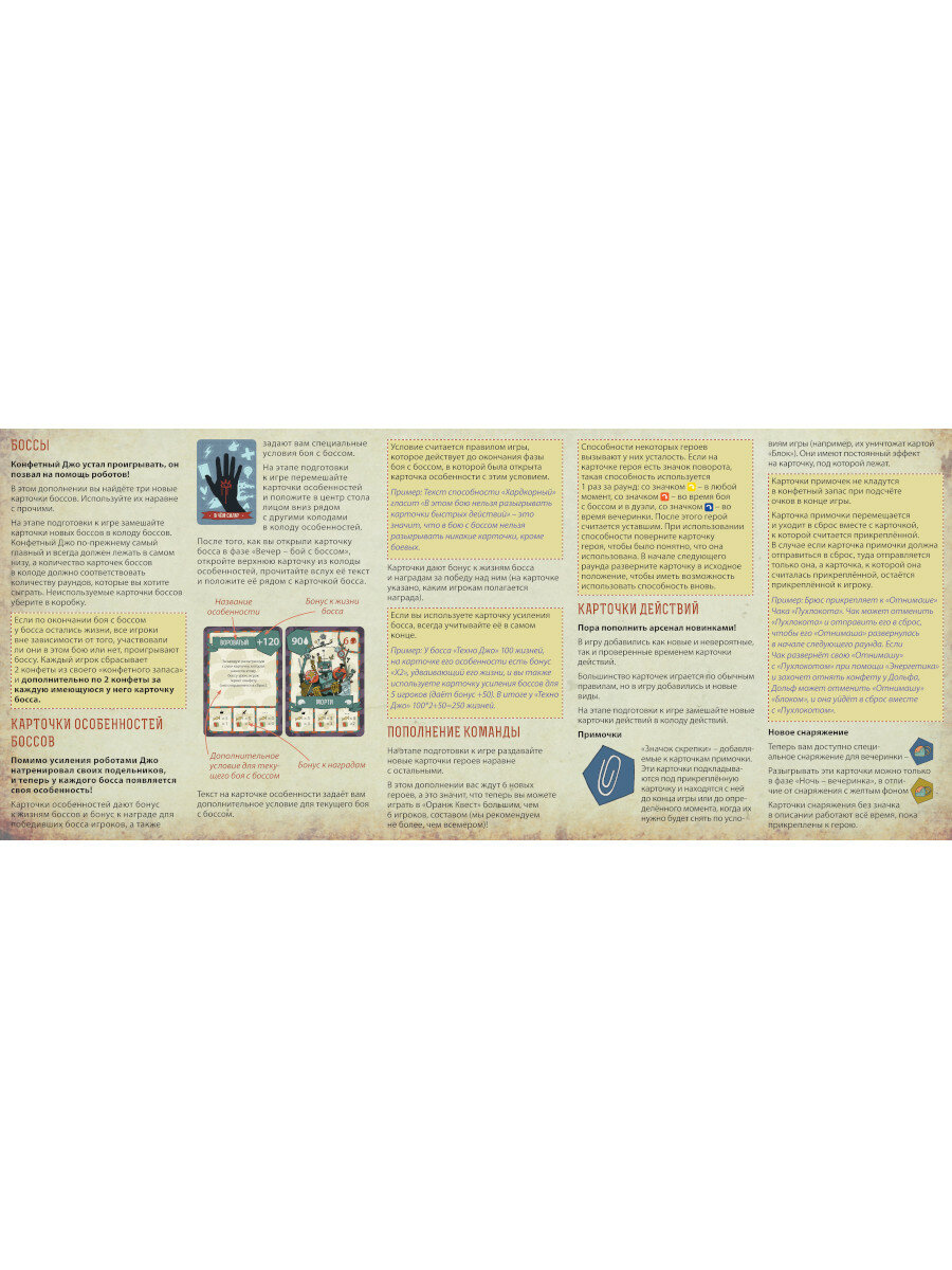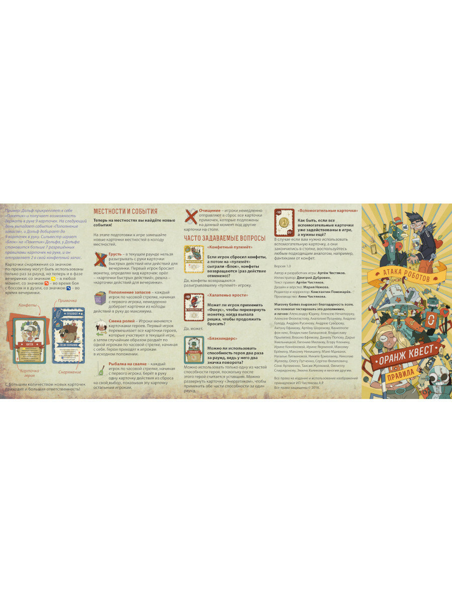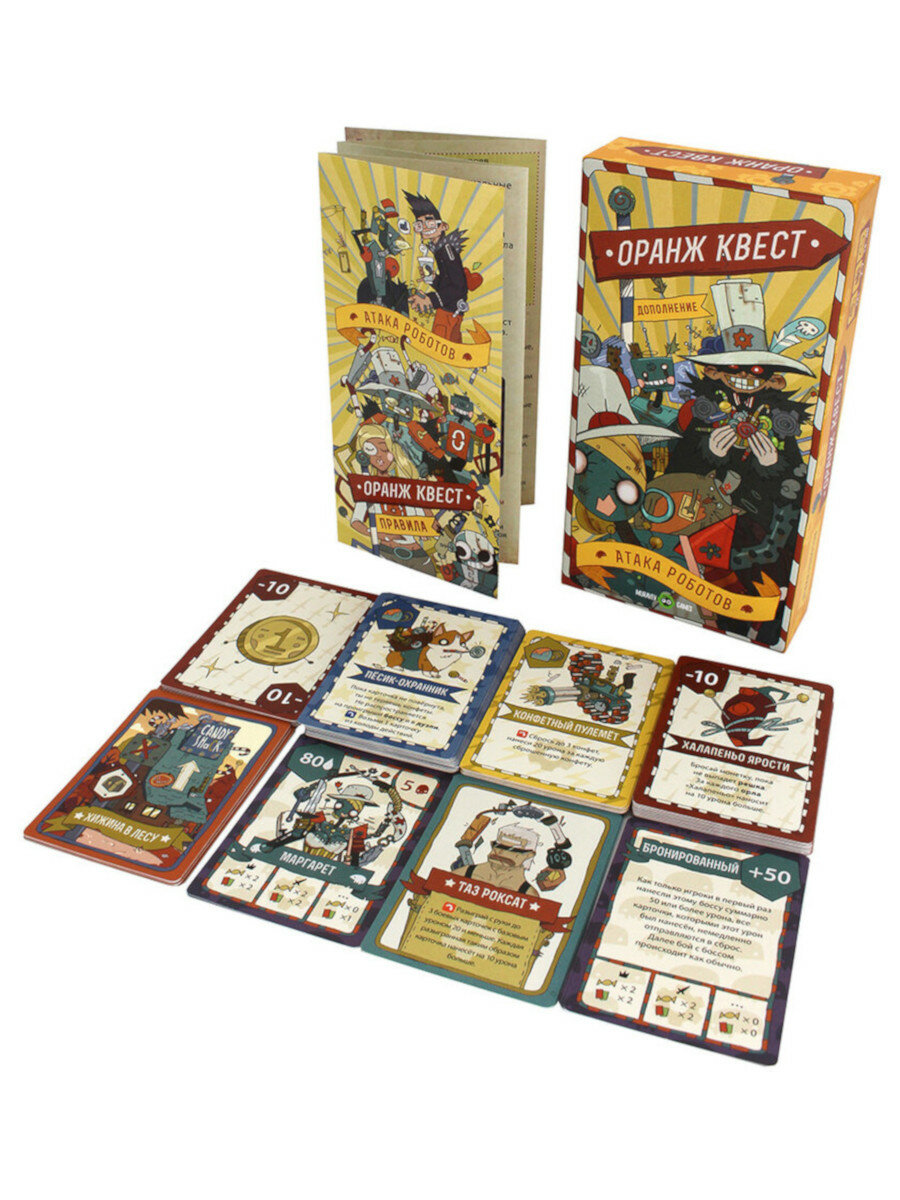 | Комплектация | 64 карточки действий; 6 карточек героев; 3 карточки боссов-роботов; 9 карточек особенностей боссов; 8 карточек неизведанных местностей; 10 вспомогательных карточек урона |