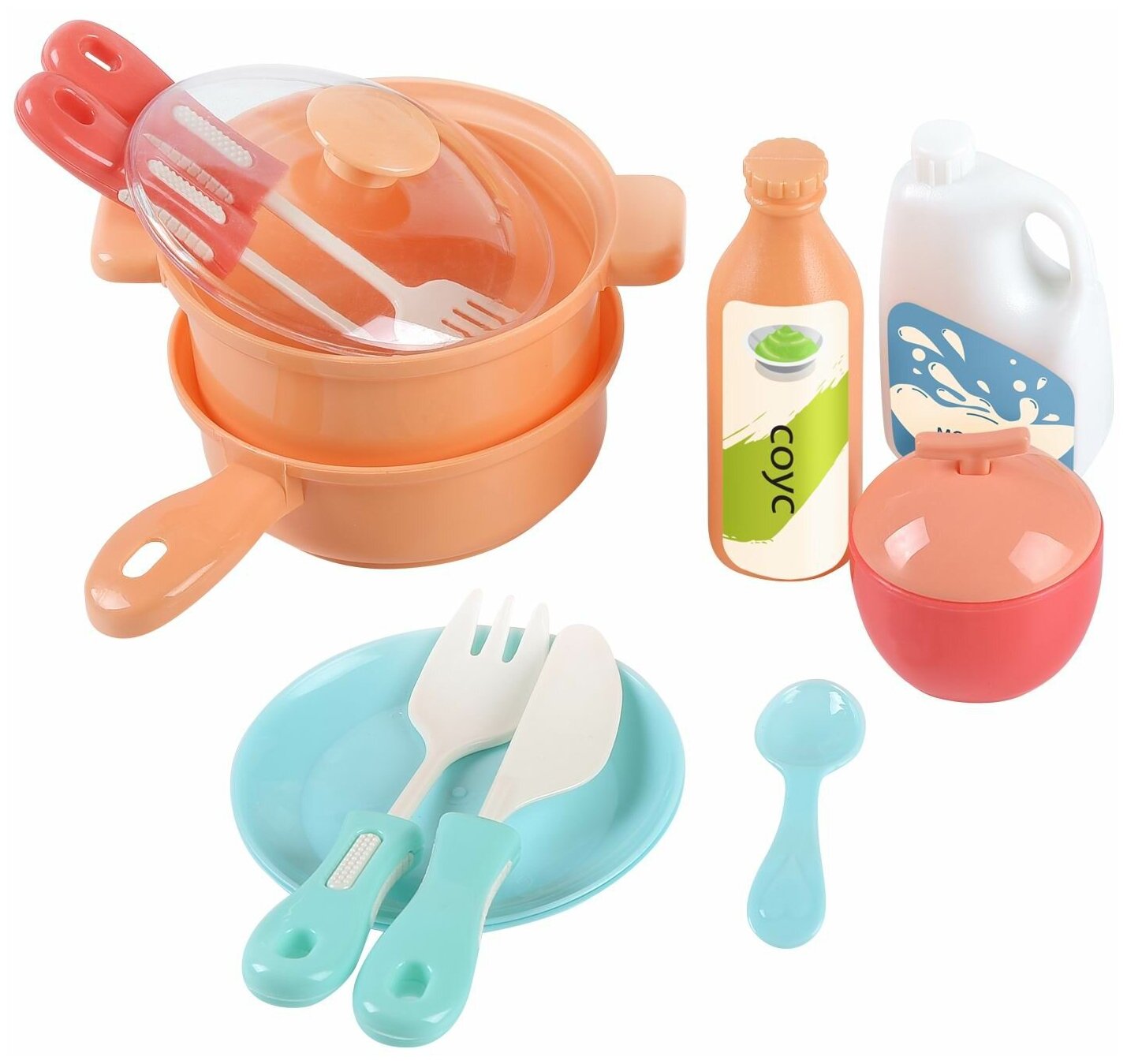 кастрюля с крышкой, сковорода, сахарница, тарелки, столовые приборы, игрушечные продукты.