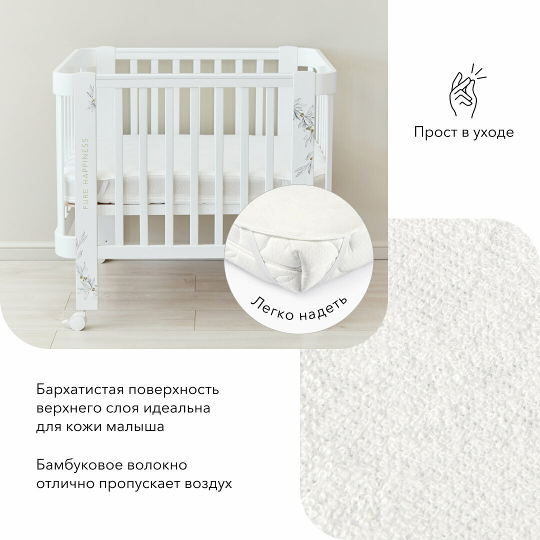 Нижняя часть выполнена из дышащей мембраны Ultrasoft, которая не только гарантирует уверенную защиту от влаги, но и обеспечивает вентиляцию. Верхний слой выполнен из бархатистой бамбуковой ткани Bamboo – материала, состоящего из приятного на ощупь бамбукового волокна. Такая мягкая поверхность идеальна для нежной детской кожи и создает дополнительный уют во время сна и отдыха.