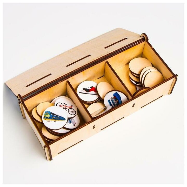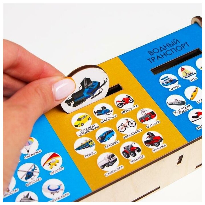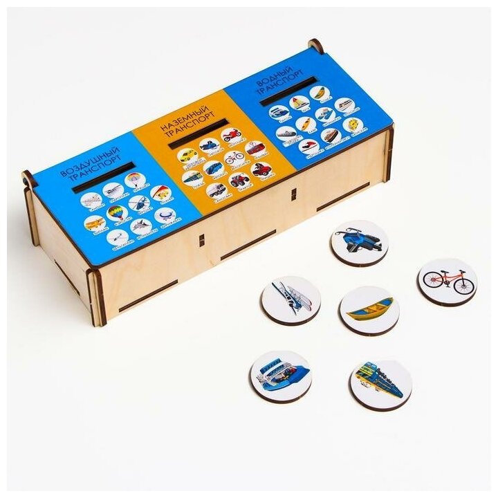 Рассмотрите с ребенком фишки. Проговорите названия видов транспорта, которые изображены на них. Расскажите о том, какой транспорт для чего необходим человеку. И как передвигается – по воде, по воздуху или по суше. Объясните, что в зависимости от того, как передвигается транспорт, виды транспорта относятся к разным категориям. Достаньте и перемешайте фишки для начала только любых двух категорий. Затем усложните задачу, перемешав все фишки, тогда, когда ребенок хорошо освоил предыдущий этап и смог правильно справиться с заданием на две категории. Важно! Покажите, как правильно находить и опускать фишки в прорезь.
