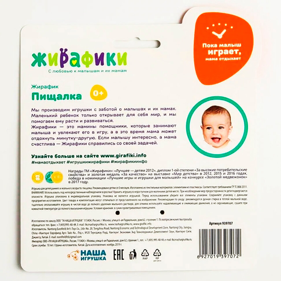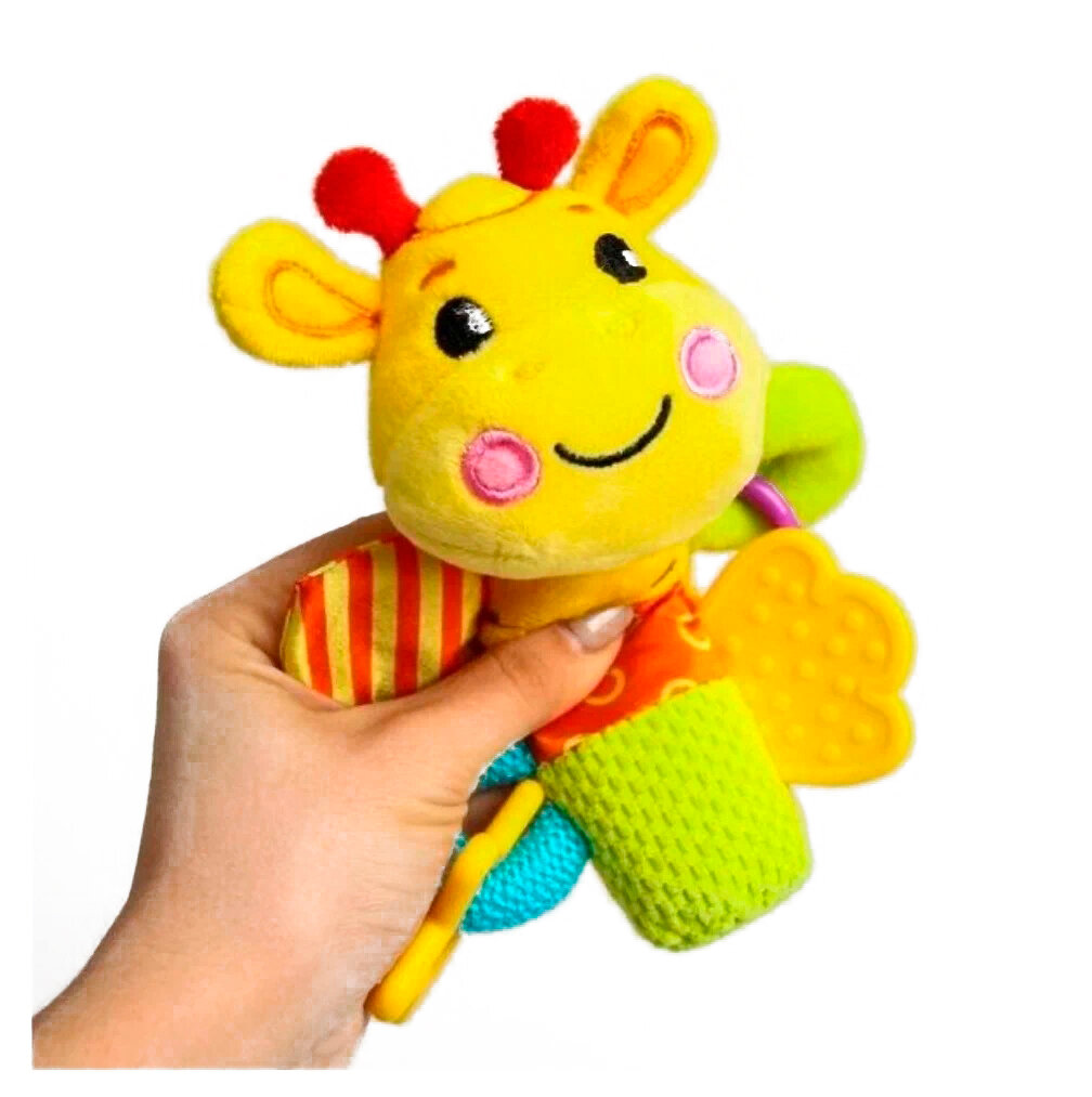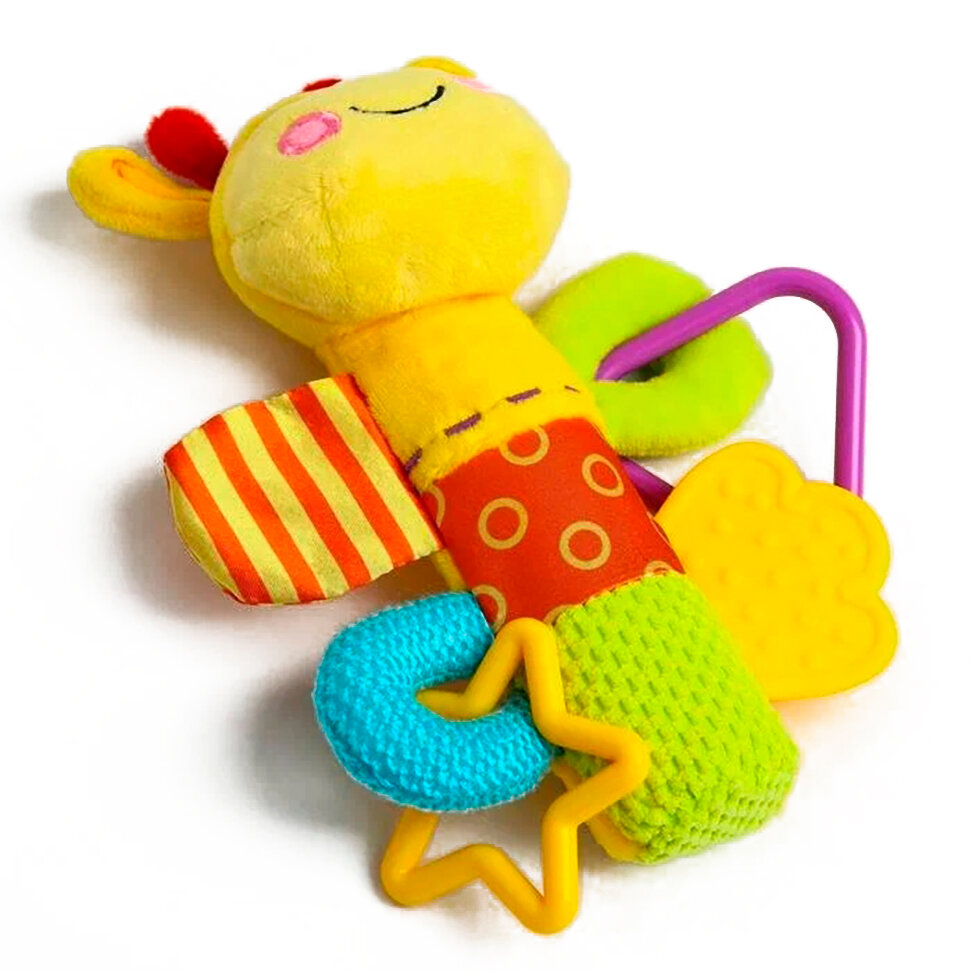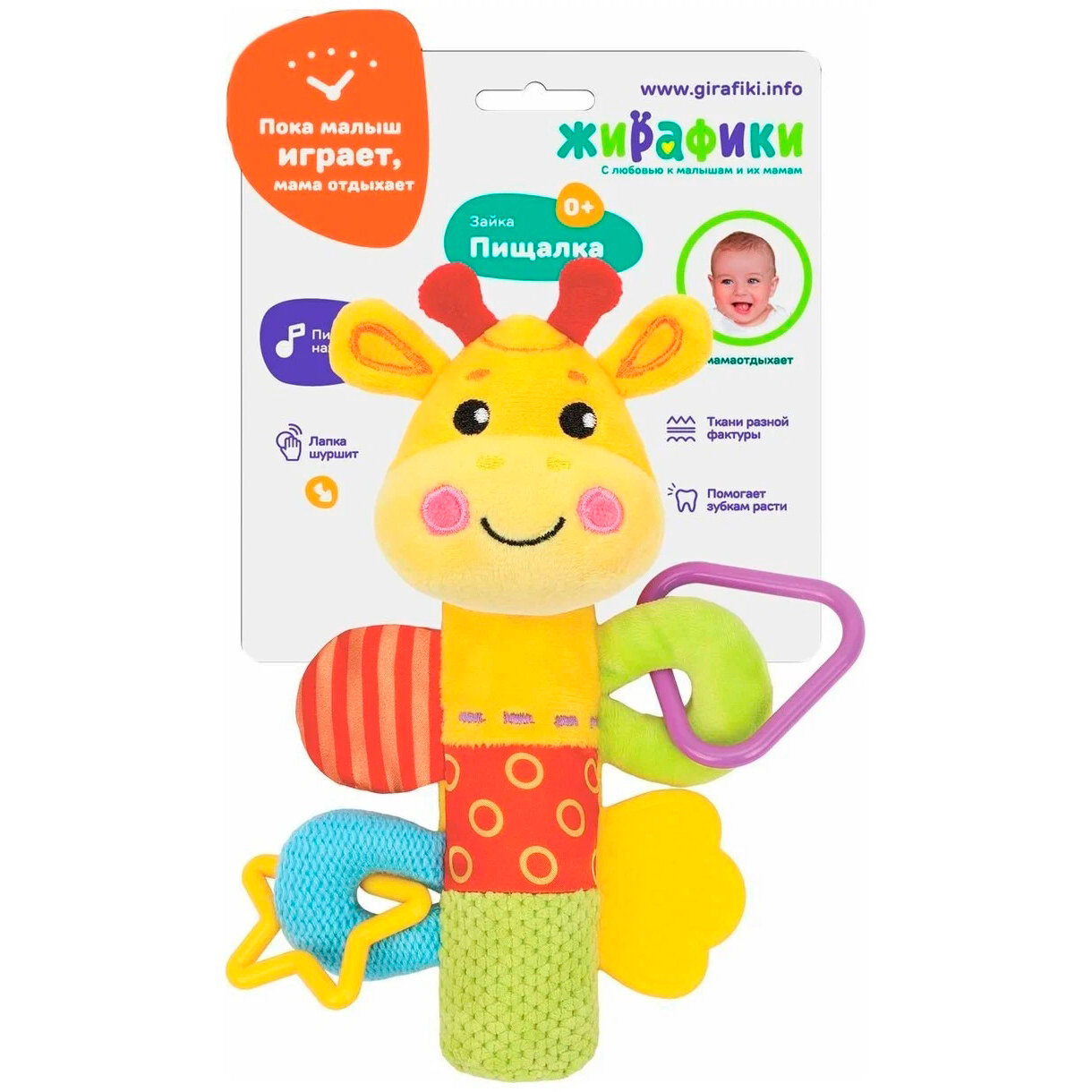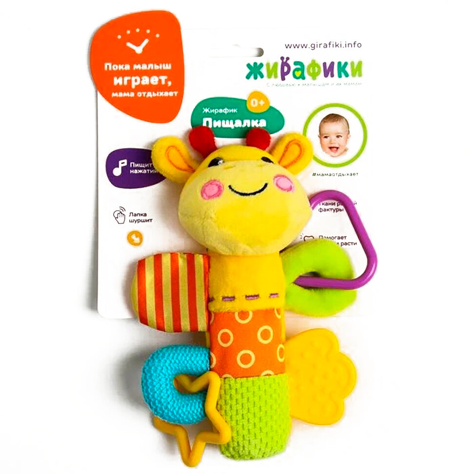 Внутри туловища этого милого жирафика спрятана звонкая пищалка. Она будет увлекать маленького непоседу каждый раз, когда он будет сжимать игрушку своей маленькой ручкой. Забавный звук пищалки поспособствует развитию у крохи хватательного рефлекса, ведь ему будет хотеться нажимать на игрушку снова и снова! Внутри одной из лапок жирафика вшита потайная шуршалка, вторая лапка представляет собой фактурный прорезыватель, остальные 2 лапки снабжены фигурными элементами - погремушками.