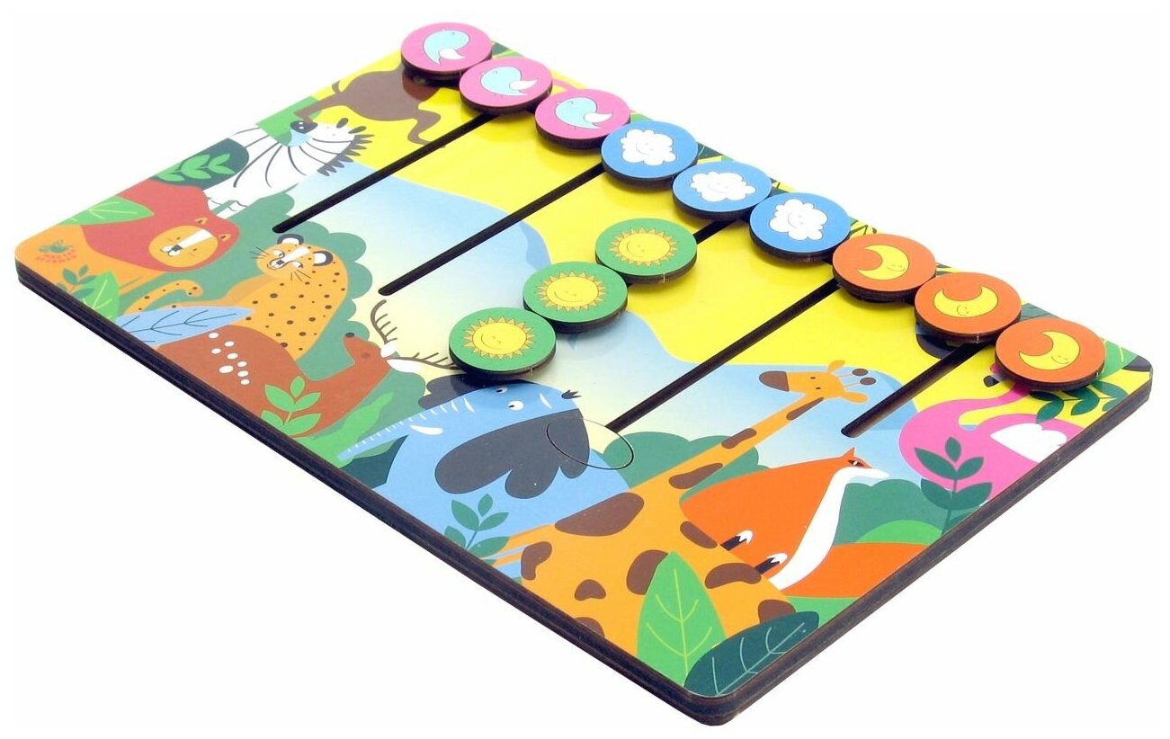 Игра - картинка с фишками, движущимися по пазам и дополнительными карточками с комбинациями расположения цветов. Правила игры: по выбранной карточке, расположить цвета в верном порядке.