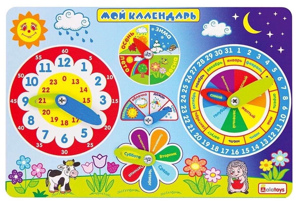Яркий дизайн этого календаря природы изображает день и ночь, солнечную и облачную погоду. Красивые цветы и животные (корова и ежик) – это темы для обсуждения домашних и диких животных. Эти темы станут отличным тренажером для развития речи.