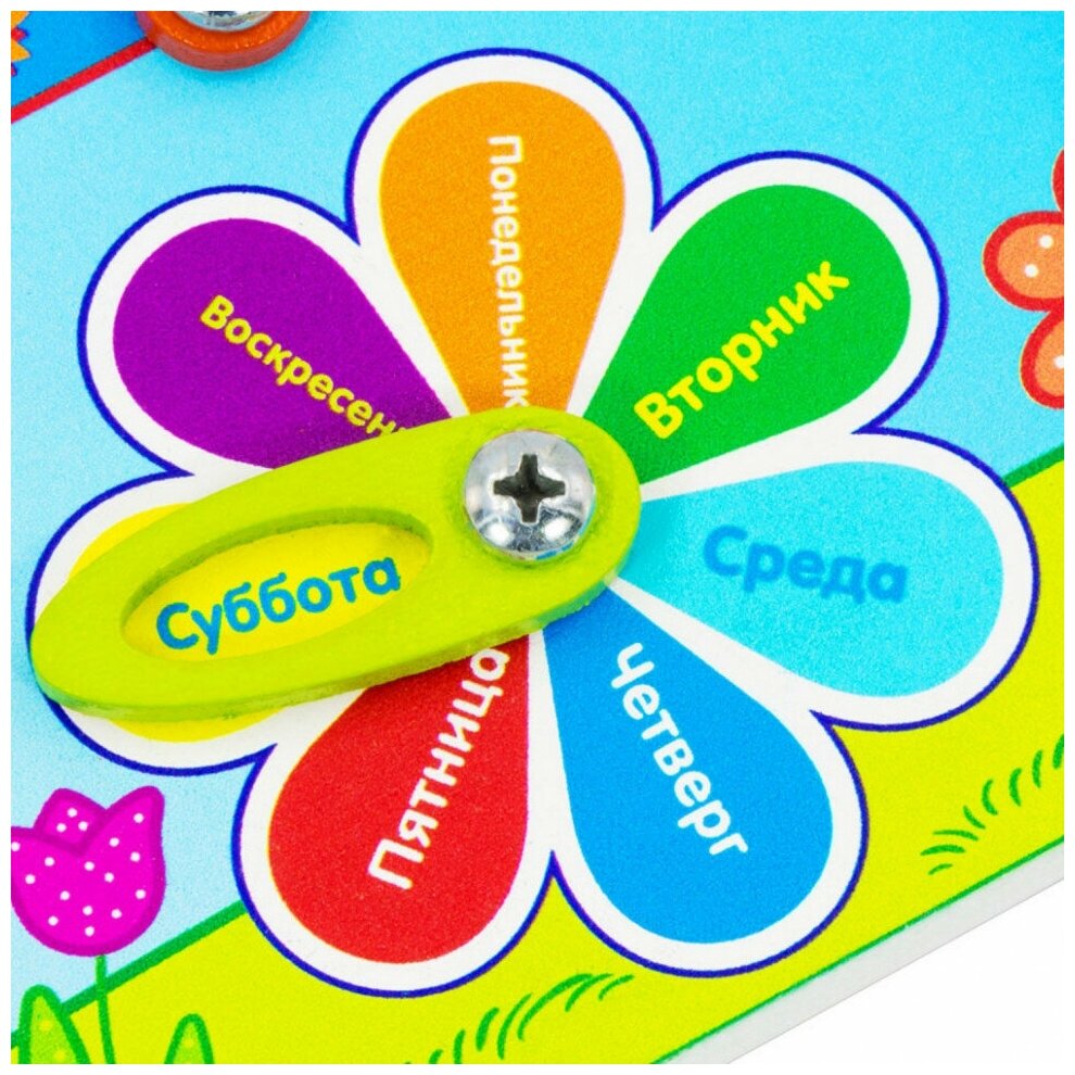Каждый день недели на предложенном цветочке –циферблате выделен отдельным цветом. Изучение дней неделей – это важная тема в формировании мировоззрения малыша. В какие дни работают мама и папа? С какого дня начинается неделя? Какие дни называются выходными (в эти дни мы не идем в садик)?