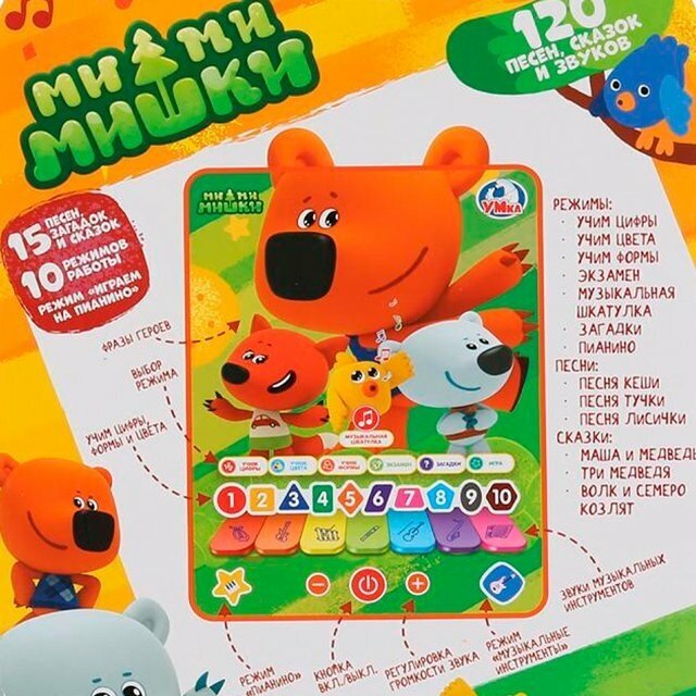 Любимые персонажи мультфильма Ми-ми-мишки приглашают детей играть и учиться. Играя с замечательным ярким и красочным развивающим планшетом с Ми-ми-мишками, ребёнок будет развивать фантазию и воображение, выучит цифры, формы и цвета. Воспроизводит 15 песен, сказок и звуков.