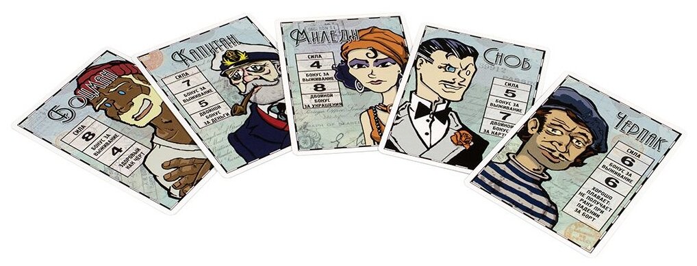 | Комплектация | 42 карты припасов; 6 карт персонажей; 6 карт мест на лодке; 6 карт врагов; 6 карт друзей; 24 карты навигации; Маркеры усталости; Маркеры ранения; Правила. Размер карт 63x89 мм. |