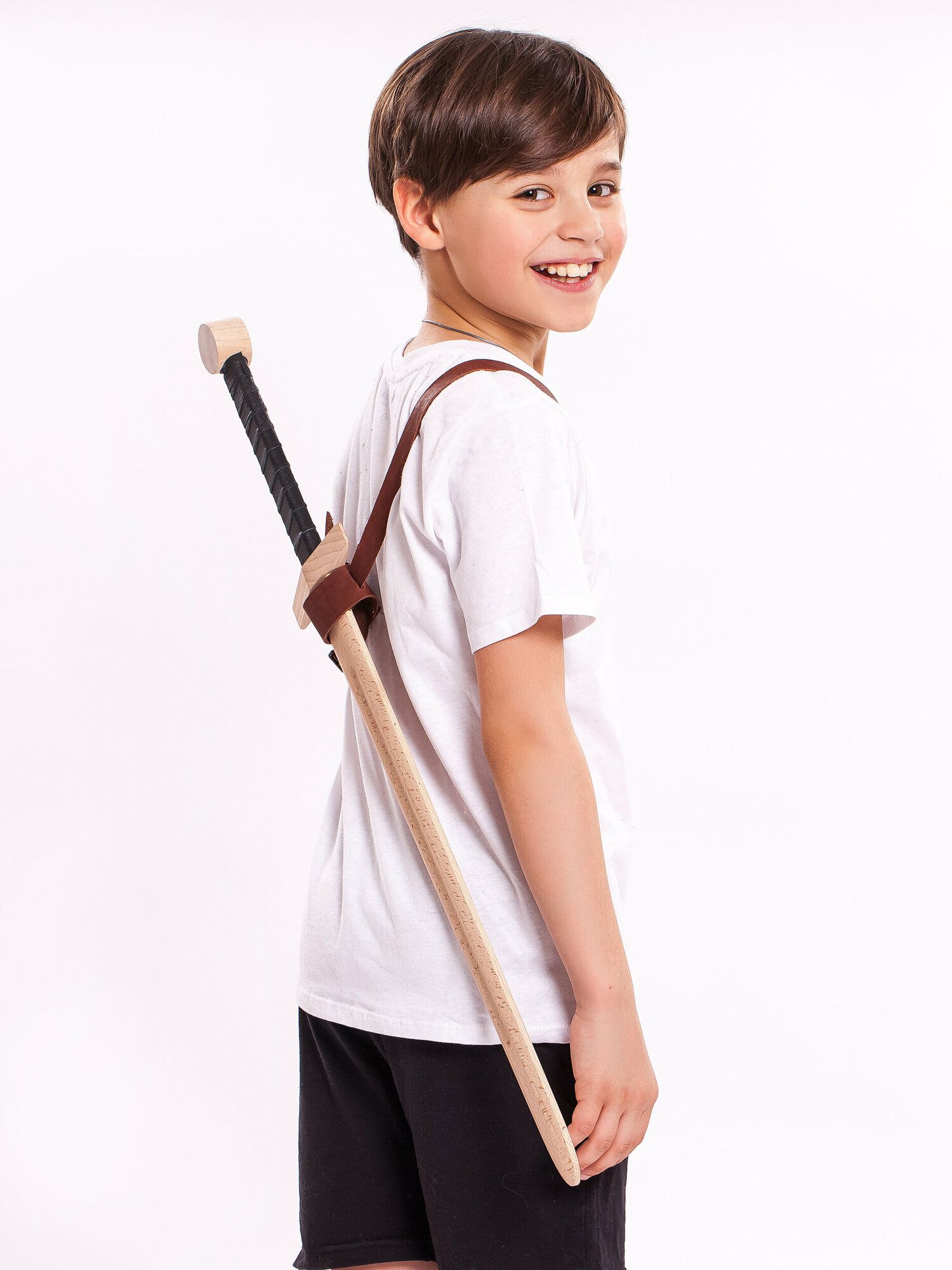 Детское деревянное оружие изготовлено из массива бука, отшлифовано. На рукоятках используется натуральная кожа, чтобы рука не скользила. Выдерживает самые сильные удары и готова к полноценной игре или занятиям в кружках, секциях.
