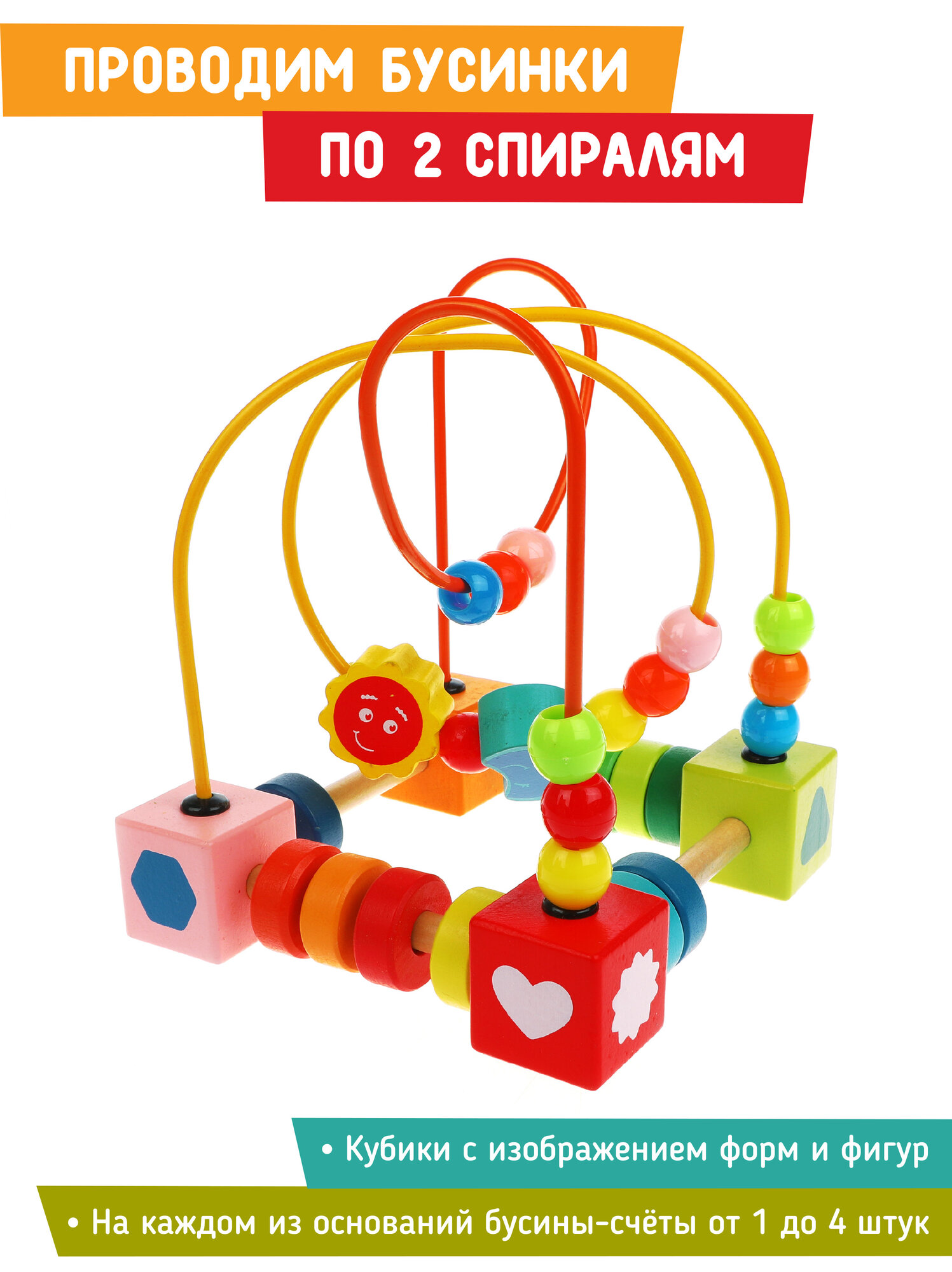 Игрушка способствует развитию логики и пространственных представлений, а ещё с её помощью можно учиться считать. На каждой из четырёх сторон-оснований лабиринта также имеются бусины в количестве 1-й, 2-х, 3-х и 4-х штук.