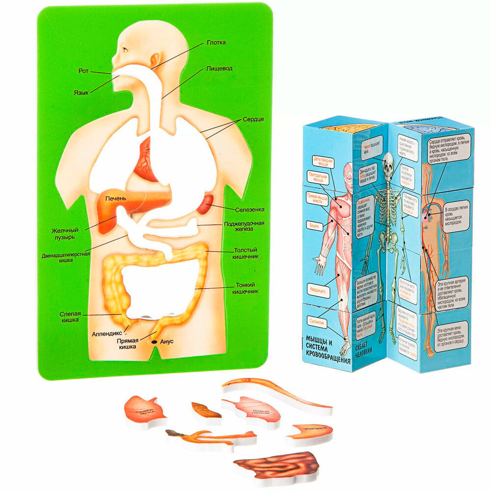 В увлекательной игровой форме, сочетающей в себе элементы игры в пазлы, кубики и логические построения, ребенок приобретет базовые знания по анатомии и физиологии человека. Из каких фрагментов состоит скелет, мышечная, нервная и сосудистая система? Как еда путешествует по организму? Где располагаются сердце и печень и каковы их функции?