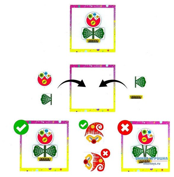 В наборе игровое поле, листовка с примерами сборки картинок, 54 магнитных элементов, прозрачная плёнка для анимации фигурок.