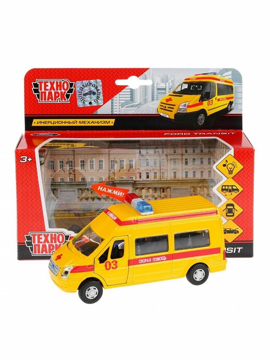 - Музыкальная пластиковая модель машины скорая помощь "Ford Transit" от ТМ "Технопарк"