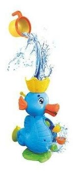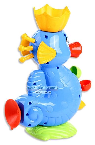 Набор представляет массу возможностей для игры с водой - зачерпывать в ковшик водичку (или набирать из крана), лить водичку, смотреть как она из ротика Морского конька попадает на маленькие черпачки и заставляет их весело вращаться. Присоска позволяет прикрепить игрушку к стене ванной.