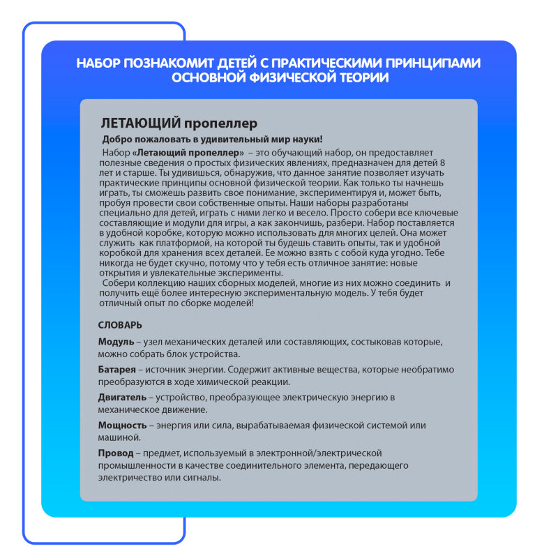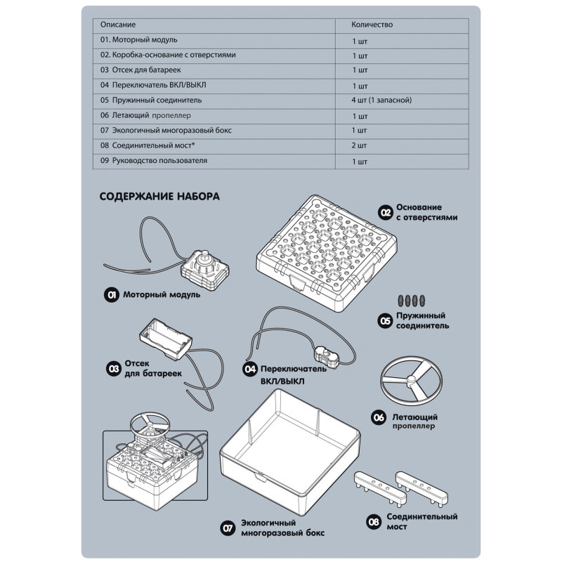 | Состав набора | моторный модуль; коробка-основание с отверстиями; отсек для батареек; переключатель; пружинный соединитель; летающий пропеллер; экологичный многоразовый бокс; соединительный мост; руководство пользователя |