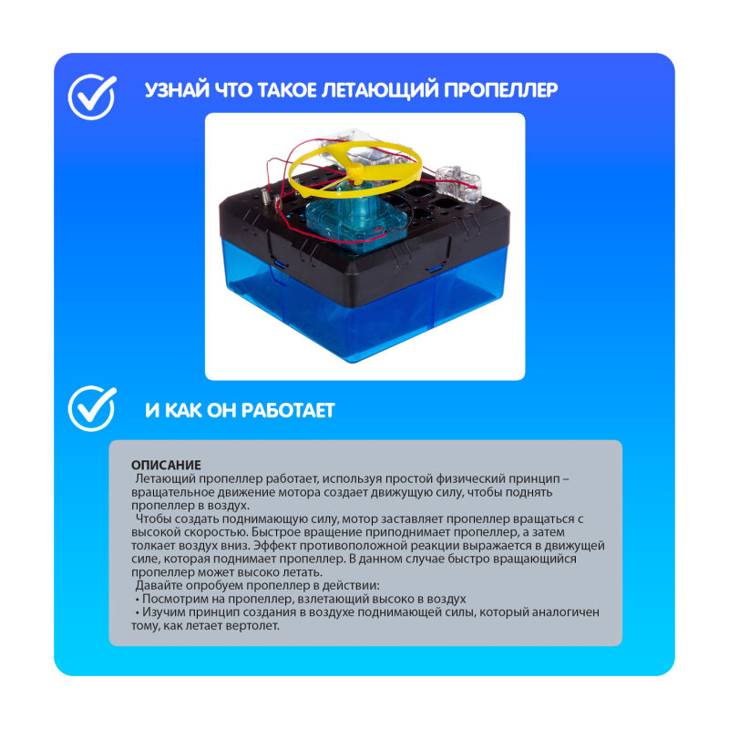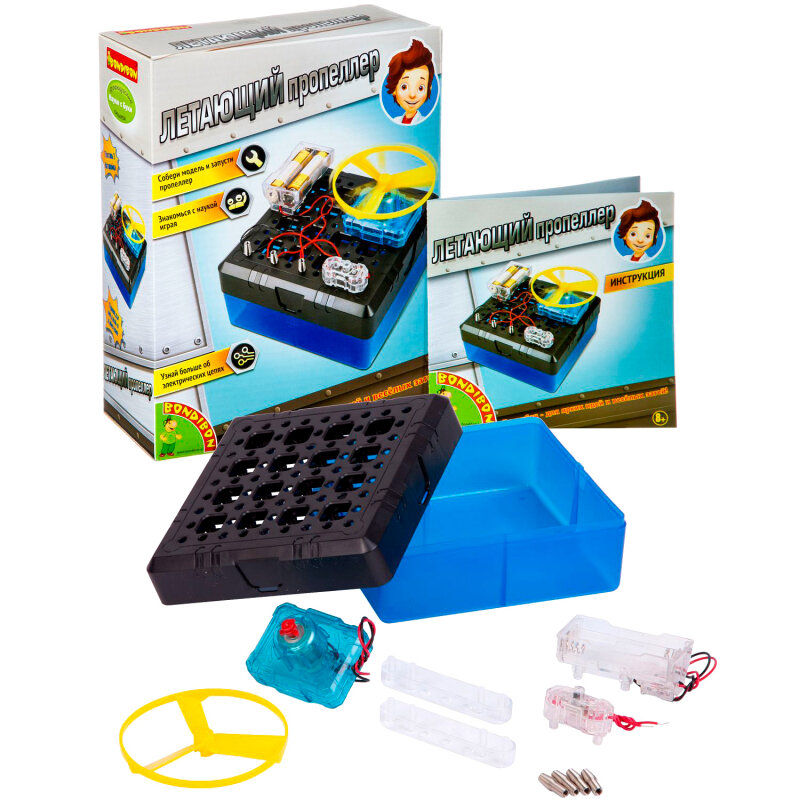 Летающий пропеллер - это обучающий набор, представляющий полезные сведенья о простых физических явлениях, предназначенный для детей от 8 лет. Этот пропеллер работает используя простой физический принцип - вращательное движение мотора создает движущую сиду, чтобы поднять пропеллер в воздух. Играя с моделью из набора, дети узнают о том, что такое: поднимающая и движущая сила, эффект противоположной реакции и многое другое.