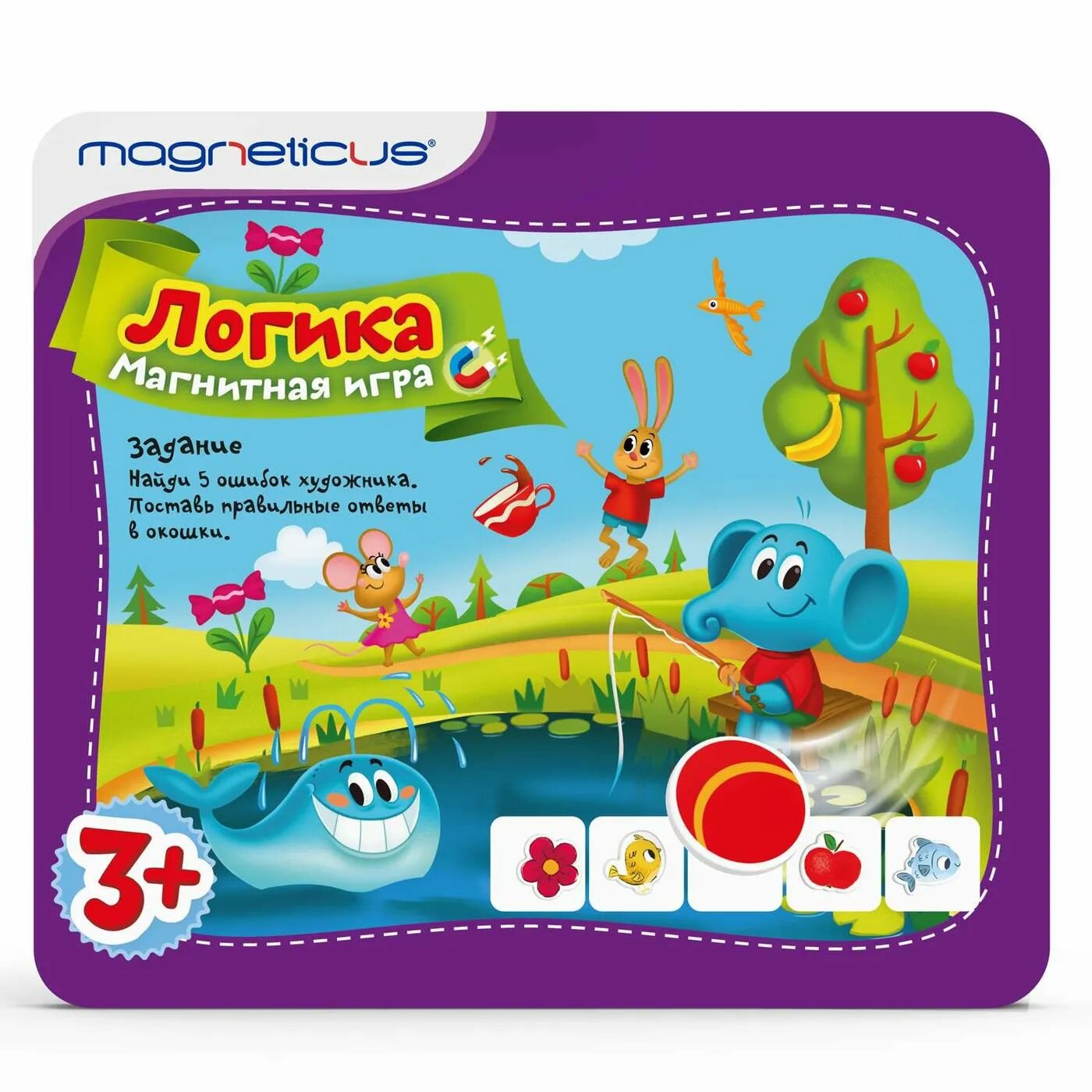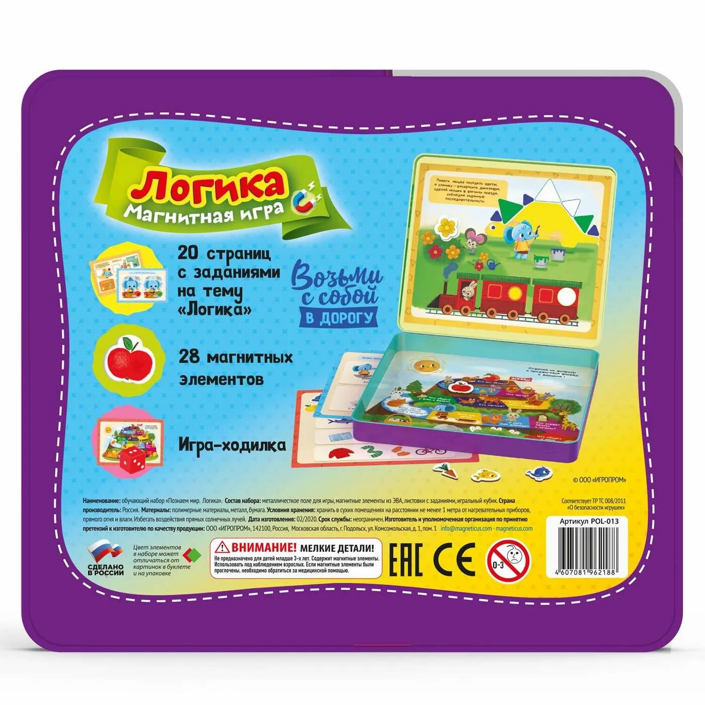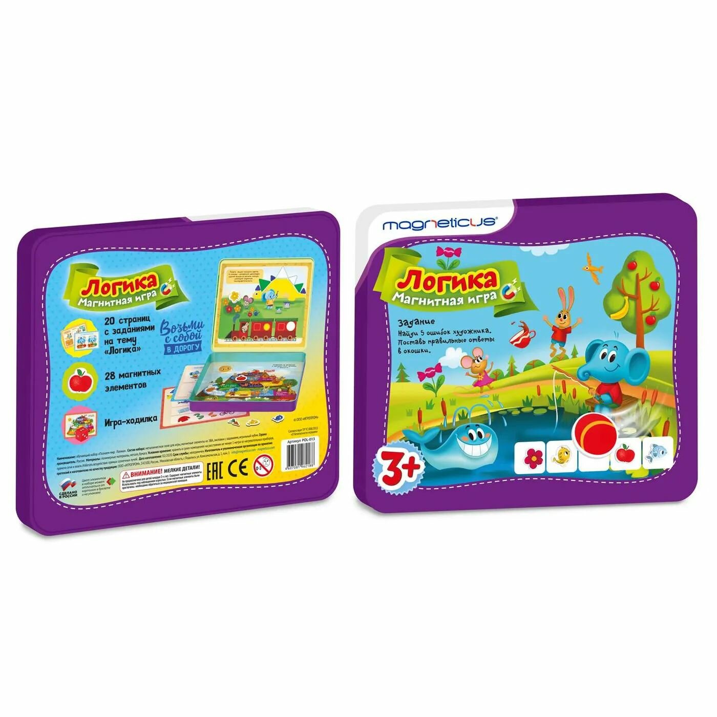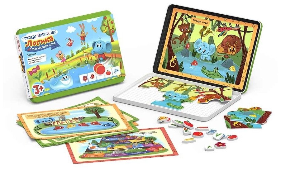 | Комплектация | 28 магнитных элементов,15 игровых заданий на тему «Логика», встроенное металлическое игровое поле, игра-ходилка |